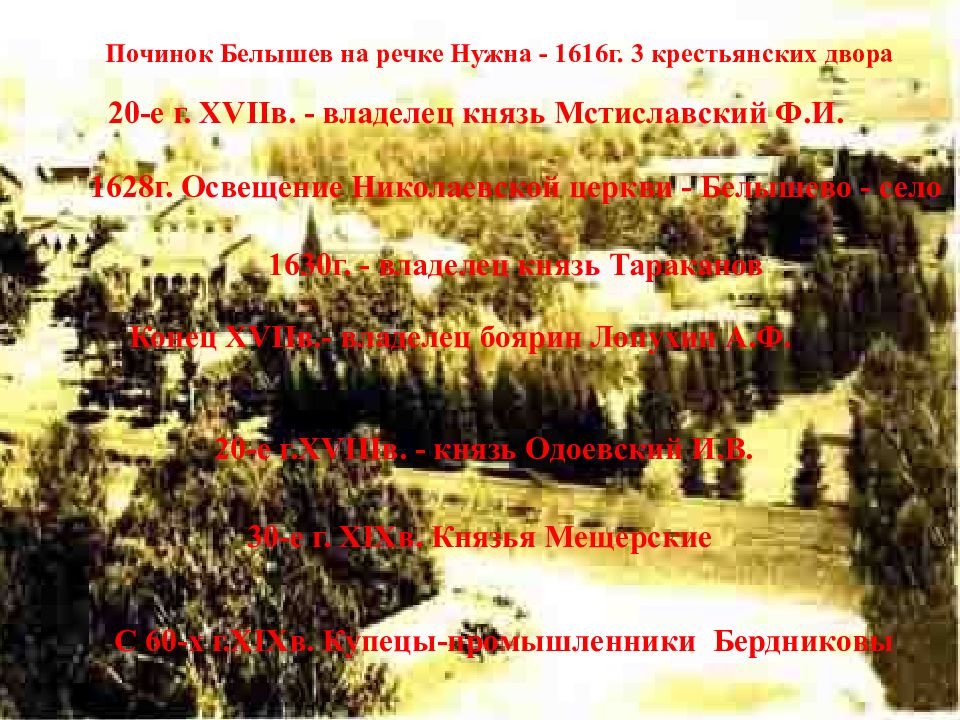 Починок Белышев на речке Нужна - 1616г. 3 крестьянских двора 20-е г. XVII в. - владелец князь Мстиславский Ф.И. 1628г. Освещение Николаевской церкви - Белышево - село 1630г. - владелец князь Тараканов Конец XVII в.- владелец боярин Лопухин А.Ф. 20-е г.XVIIIв. - князь Одоевский И.В. 30-е г. XIXв. Князья Мещерские С 60-х г. XIX в. Купецы-промышленники Бердниковы