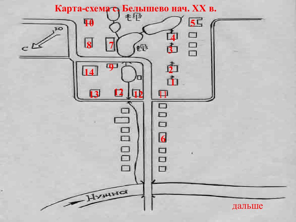 1 2 3 7 8 9 11 14 4 5 6 10 12 12 13 дальше Карта-схема с. Белышево нач. XX в.