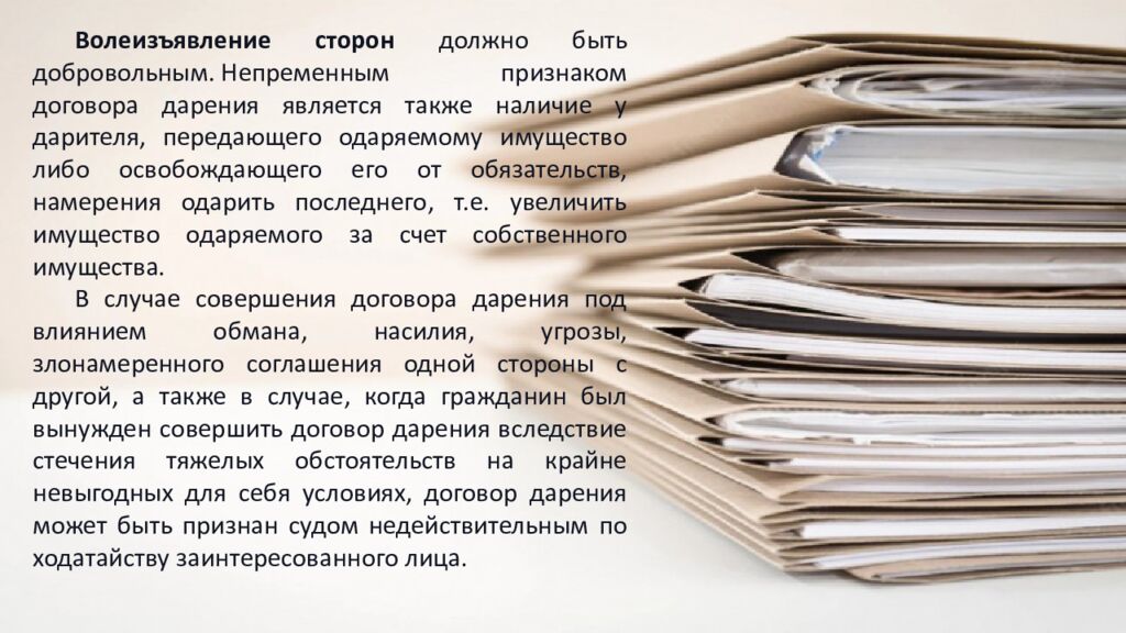 Волеизъявление сторон должно быть добровольным. Непременным признаком договора дарения является также наличие у дарителя, передающего одаряемому имущество либо освобождающего его от обязательств, намерения одарить последнего, т.е. увеличить имущество одаряемого за счет собственного имущества. В случае совершения договора дарения под влиянием обмана, насилия, угрозы, злонамеренного соглашения одной стороны с другой, а также в случае, когда гражданин был вынужден совершить договор дарения вследствие стечения тяжелых обстоятельств на крайне невыгодных для себя условиях, договор дарения может быть признан судом недействительным по ходатайству заинтересованного лица.