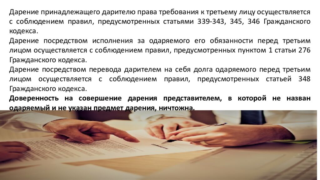 Дарение принадлежащего дарителю права требования к третьему лицу осуществляется с соблюдением правил, предусмотренных статьями 339-343, 345, 346 Гражданского кодекса. Дарение посредством исполнения за одаряемого его обязанности перед третьим лицом осуществляется с соблюдением правил, предусмотренных пунктом 1 статьи 276 Гражданского кодекса. Дарение посредством перевода дарителем на себя долга одаряемого перед третьим лицом осуществляется с соблюдением правил, предусмотренных статьей 348 Гражданского кодекса. Доверенность на совершение дарения представителем, в которой не назван одаряемый и не указан предмет дарения, ничтожна.