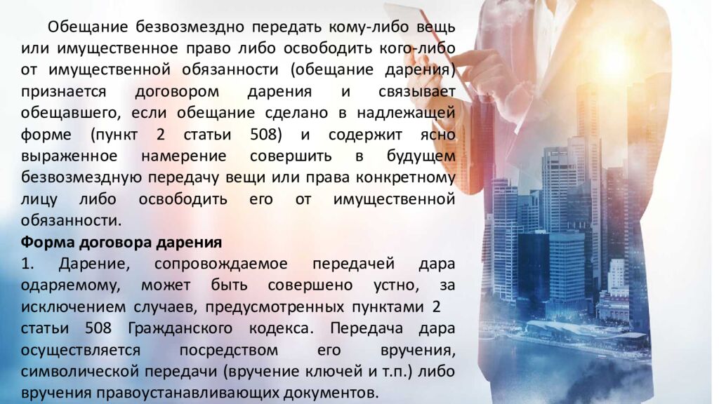 Обещание безвозмездно передать кому-либо вещь или имущественное право либо освободить кого-либо от имущественной обязанности (обещание дарения) признается договором дарения и связывает обещавшего, если обещание сделано в надлежащей форме (пункт 2 статьи 508) и содержит ясно выраженное намерение совершить в будущем безвозмездную передачу вещи или права конкретному лицу либо освободить его от имущественной обязанности. Форма договора дарения 1. Дарение, сопровождаемое передачей дара одаряемому, может быть совершено устно, за исключением случаев, предусмотренных пунктами 2 статьи 508 Гражданского кодекса. Передача дара осуществляется посредством его вручения, символической передачи (вручение ключей и т.п.) либо вручения правоустанавливающих документов.