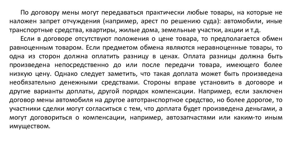 По договору мены могут передаваться практически любые товары, на которые не наложен запрет отчуждения (например, арест по решению суда): автомобили, иные транспортные средства, квартиры, жилые дома, земельные участки, акции и т.д. Если в договоре отсутствуют положения о цене товара, то предполагается обмен равноценным товаром. Если предметом обмена являются неравноценные товары, то одна из сторон должна оплатить разницу в ценах. Оплата разницы должна быть произведена непосредственно до или после передачи товара, имеющего более низкую цену. Однако следует заметить, что такая доплата может быть произведена необязательно денежными средствами. Стороны вправе установить в договоре и другие варианты доплаты, другой порядок компенсации. Например, если заключен договор мены автомобиля на другое автотранспортное средство, но более дорогое, то участники сделки могут согласиться с тем, что доплата будет произведена деньгами, а могут договориться о компенсации, например, автозапчастями или каким-то иным имуществом.