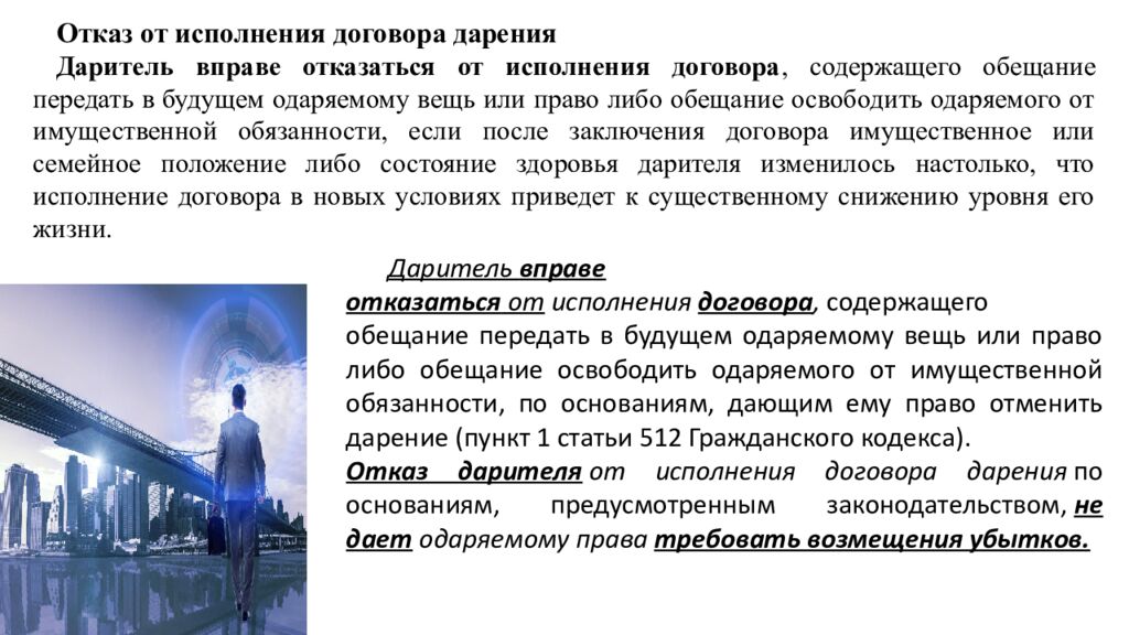 Отказ от исполнения договора дарения Даритель вправе отказаться от исполнения договора, содержащего обещание передать в будущем одаряемому вещь или право либо обещание освободить одаряемого от имущественной обязанности, если после заключения договора имущественное или семейное положение либо состояние здоровья дарителя изменилось настолько, что исполнение договора в новых условиях приведет к существенному снижению уровня его жизни. Даритель вправе отказаться от исполнения договора, содержащего обещание передать в будущем одаряемому вещь или право либо обещание освободить одаряемого от имущественной обязанности, по основаниям, дающим ему право отменить дарение (пункт 1 статьи 512 Гражданского кодекса). Отказ дарителя от исполнения договора дарения по основаниям, предусмотренным законодательством, не дает одаряемому права требовать возмещения убытков.