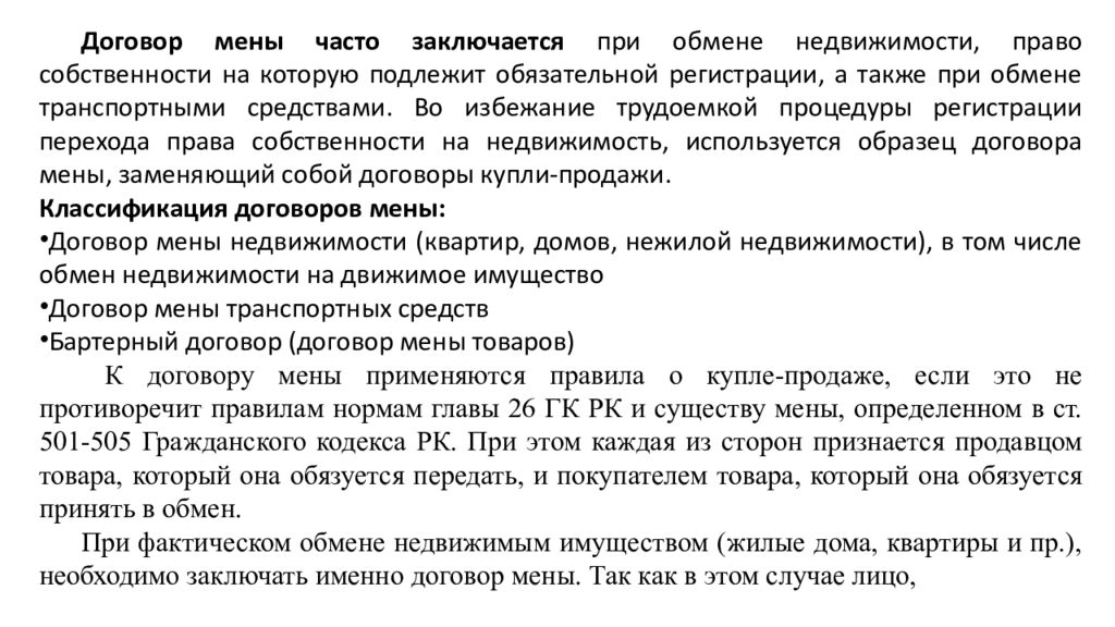 Договор мены часто заключается при обмене недвижимости, право собственности на которую подлежит обязательной регистрации, а также при обмене транспортными средствами. Во избежание трудоемкой процедуры регистрации перехода права собственности на недвижимость, используется образец договора мены, заменяющий собой договоры купли-продажи. Классификация договоров мены: Договор мены недвижимости (квартир, домов, нежилой недвижимости), в том числе обмен недвижимости на движимое имущество Договор мены транспортных средств Бартерный договор (договор мены товаров) К договору мены применяются правила о купле-продаже, если это не противоречит правилам нормам главы 26 ГК РК и существу мены, определенном в ст. 501-505 Гражданского кодекса РК. При этом каждая из сторон признается продавцом товара, который она обязуется передать, и покупателем товара, который она обязуется принять в обмен. При фактическом обмене недвижимым имуществом (жилые дома, квартиры и пр.), необходимо заключать именно договор мены. Так как в этом случае лицо,