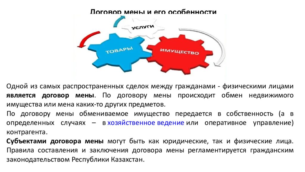Договор мены и его особенности Одной из самых распространенных сделок между гражданами - физическими лицами является договор мены. По договору мены происходит обмен недвижимого имущества или мена каких-то других предметов. По договору мены обмениваемое имущество передается в собственность (а в определенных случаях – в хозяйственное ведение или оперативное управление) контрагента. Субъектами договора мены могут быть как юридические, так и физические лица. Правила составления и заключения договора мены регламентируется гражданским законодательством Республики Казахстан.
