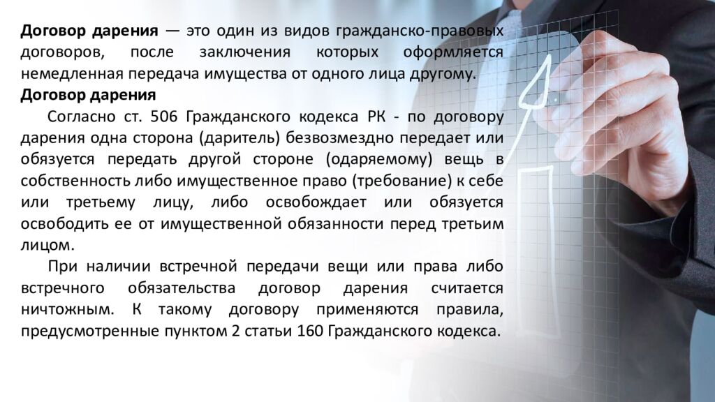 Договор дарения — это один из видов гражданско-правовых договоров, после заключения которых оформляется немедленная передача имущества от одного лица другому. Договор дарения Согласно ст. 506 Гражданского кодекса РК - по договору дарения одна сторона (даритель) безвозмездно передает или обязуется передать другой стороне (одаряемому) вещь в собственность либо имущественное право (требование) к себе или третьему лицу, либо освобождает или обязуется освободить ее от имущественной обязанности перед третьим лицом. При наличии встречной передачи вещи или права либо встречного обязательства договор дарения считается ничтожным. К такому договору применяются правила, предусмотренные пунктом 2 статьи 160 Гражданского кодекса.
