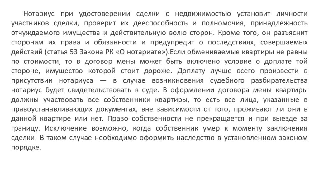 Нотариус при удостоверении сделки с недвижимостью установит личности участников сделки, проверит их дееспособность и полномочия, принадлежность отчуждаемого имущества и действительную волю сторон. Кроме того, он разъяснит сторонам их права и обязанности и предупредит о последствиях, совершаемых действий (статья 53 Закона РК «О нотариате»).Если обмениваемые квартиры не равны по стоимости, то в договор мены может быть включено условие о доплате той стороне, имущество которой стоит дороже. Доплату лучше всего произвести в присутствии нотариуса — в случае возникновения судебного разбирательства нотариус будет свидетельствовать в суде. В оформлении договора мены квартиры должны участвовать все собственники квартиры, то есть все лица, указанные в правоустанавливающих документах, вне зависимости от того, проживают ли они в данной квартире или нет. Право собственности не прекращается и при выезде за границу. Исключение возможно, когда собственник умер к моменту заключения сделки. В таком случае необходимо оформить наследство в установленном законом порядке.