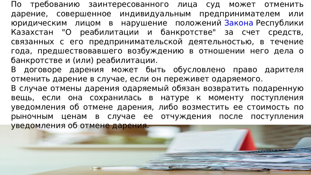 По требованию заинтересованного лица суд может отменить дарение, совершенное индивидуальным предпринимателем или юридическим лицом в нарушение положений Закона Республики Казахстан "О реабилитации и банкротстве" за счет средств, связанных с его предпринимательской деятельностью, в течение года, предшествовавшего возбуждению в отношении него дела о банкротстве и (или) реабилитации. В договоре дарения может быть обусловлено право дарителя отменить дарение в случае, если он переживет одаряемого. В случае отмены дарения одаряемый обязан возвратить подаренную вещь, если она сохранилась в натуре к моменту поступления уведомления об отмене дарения, либо возместить ее стоимость по рыночным ценам в случае ее отчуждения после поступления уведомления об отмене дарения.