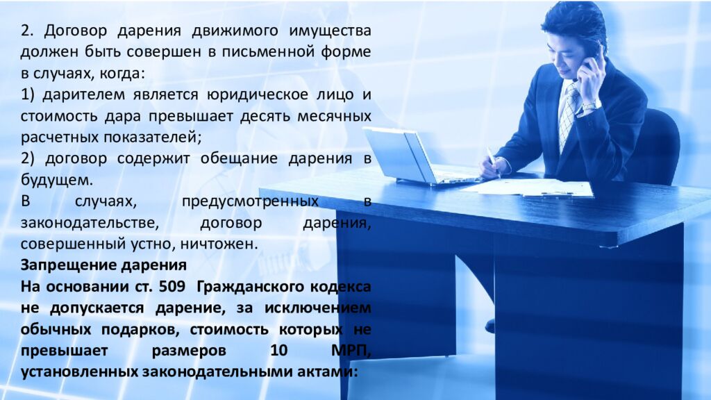 2. Договор дарения движимого имущества должен быть совершен в письменной форме в случаях, когда: 1) дарителем является юридическое лицо и стоимость дара превышает десять месячных расчетных показателей; 2) договор содержит обещание дарения в будущем. В случаях, предусмотренных в законодательстве, договор дарения, совершенный устно, ничтожен. Запрещение дарения На основании ст. 509 Гражданского кодекса не допускается дарение, за исключением обычных подарков, стоимость которых не превышает размеров 10 МРП, установленных законодательными актами: