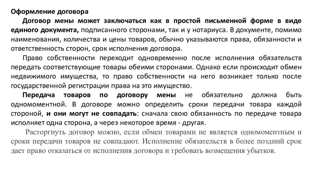 Оформление договора Договор мены может заключаться как в простой письменной форме в виде единого документа, подписанного сторонами, так и у нотариуса. В документе, помимо наименования, количества и цены товаров, обычно указываются права, обязанности и ответственность сторон, срок исполнения договора. Право собственности переходит одновременно после исполнения обязательств передать соответствующие товары обеими сторонами. Однако если происходит обмен недвижимого имущества, то право собственности на него возникает только после государственной регистрации права на это имущество. Передача товаров по договору мены не обязательно должна быть одномоментной. В договоре можно определить сроки передачи товара каждой стороной, и они могут не совпадать : сначала свою обязанность по передаче товара исполняет одна сторона, а через некоторое время - другая. Расторгнуть договор можно, если обмен товарами не является одномоментным и сроки передачи товаров не совпадают. Исполнение обязательств в более поздний срок дает право отказаться от исполнения договора и требовать возмещения убытков.