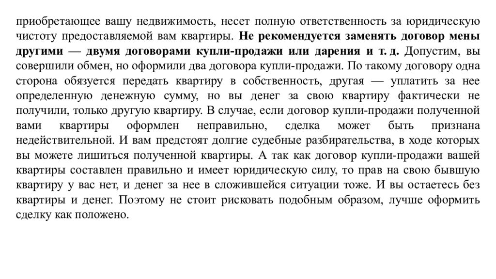 приобретающее вашу недвижимость, несет полную ответственность за юридическую чистоту предоставляемой вам квартиры. Не рекомендуется заменять договор мены другими — двумя договорами купли-продажи или дарения и т. д. Допустим, вы совершили обмен, но оформили два договора купли-продажи. По такому договору одна сторона обязуется передать квартиру в собственность, другая — уплатить за нее определенную денежную сумму, но вы денег за свою квартиру фактически не получили, только другую квартиру. В случае, если договор купли-продажи полученной вами квартиры оформлен неправильно, сделка может быть признана недействительной. И вам предстоят долгие судебные разбирательства, в ходе которых вы можете лишиться полученной квартиры. А так как договор купли-продажи вашей квартиры составлен правильно и имеет юридическую силу, то прав на свою бывшую квартиру у вас нет, и денег за нее в сложившейся ситуации тоже. И вы остаетесь без квартиры и денег. Поэтому не стоит рисковать подобным образом, лучше оформить сделку как положено.