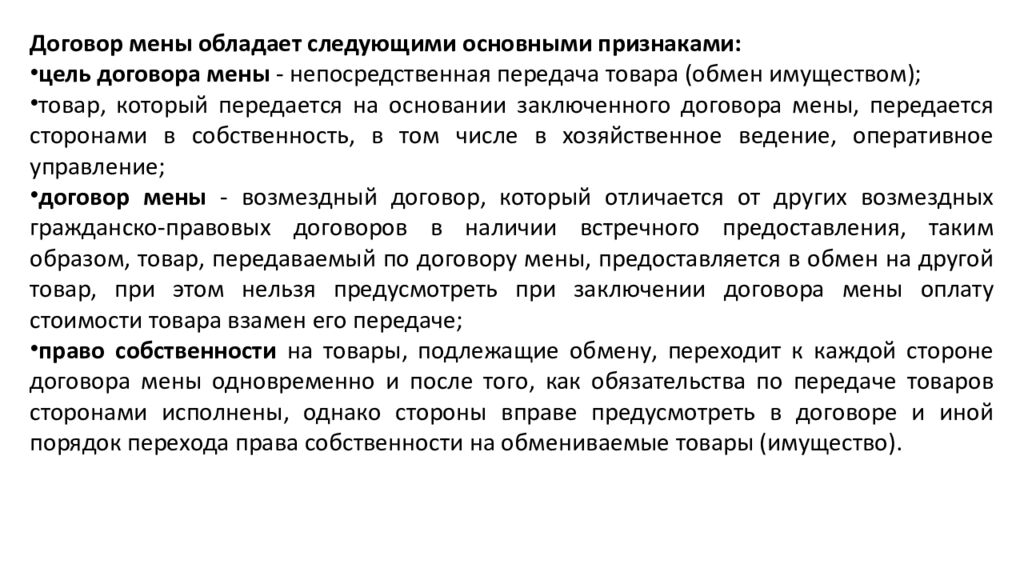 Договор мены обладает следующими основными признаками: цель договора мены - непосредственная передача товара (обмен имуществом); товар, который передается на основании заключенного договора мены, передается сторонами в собственность, в том числе в хозяйственное ведение, оперативное управление; договор мены - возмездный договор, который отличается от других возмездных гражданско-правовых договоров в наличии встречного предоставления, таким образом, товар, передаваемый по договору мены, предоставляется в обмен на другой товар, при этом нельзя предусмотреть при заключении договора мены оплату стоимости товара взамен его передаче; право собственности на товары, подлежащие обмену, переходит к каждой стороне договора мены одновременно и после того, как обязательства по передаче товаров сторонами исполнены, однако стороны вправе предусмотреть в договоре и иной порядок перехода права собственности на обмениваемые товары (имущество).