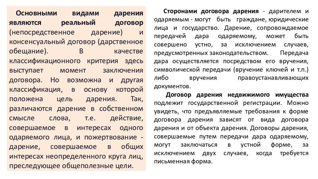 Основными видами дарения являются реальный договор (непосредственное дарение) и консенсуальный договор (дарственное обещание). В качестве классификационного критерия здесь выступает момент заключения договора. Но возможна и другая классификация, в основу которой положена цель дарения. Так, различаются дарение в собственном смысле слова, т.е. действие, совершаемое в интересах одного одаряемого лица, и пожертвование - дарение, совершаемое в общих интересах неопределенного круга лиц, преследующее общеполезные цели. Сторонами договора дарения - дарителем и одаряемым - могут быть граждане, юридические лица и государство. Дарение, сопровождаемое передачей дара одаряемому, может быть совершено устно, за исключением случаев, предусмотренных законодательством. Передача дара осуществляется посредством его вручения, символической передачи (вручение ключей и т.п.) либо вручения правоустанавливающих документов. Договор дарения недвижимого имущества подлежит государственной регистрации. Можно увидеть, что предъявляемые требования к форме договора дарения зависят от вида договора дарения и от объекта дарения. Договоры дарения, совершаемые путем передачи дара одаряемому, могут заключаться в устной форме, за исключением двух случаев, когда требуется письменная форма.
