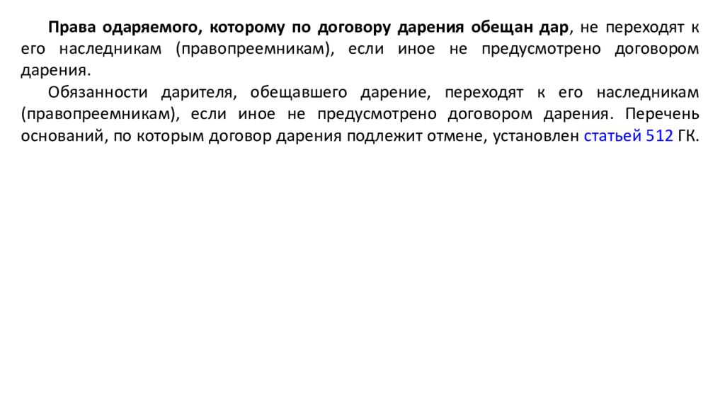 Права одаряемого, которому по договору дарения обещан дар, не переходят к его наследникам (правопреемникам), если иное не предусмотрено договором дарения. Обязанности дарителя, обещавшего дарение, переходят к его наследникам (правопреемникам), если иное не предусмотрено договором дарения. Перечень оснований, по которым договор дарения подлежит отмене, установлен статьей 512 ГК.