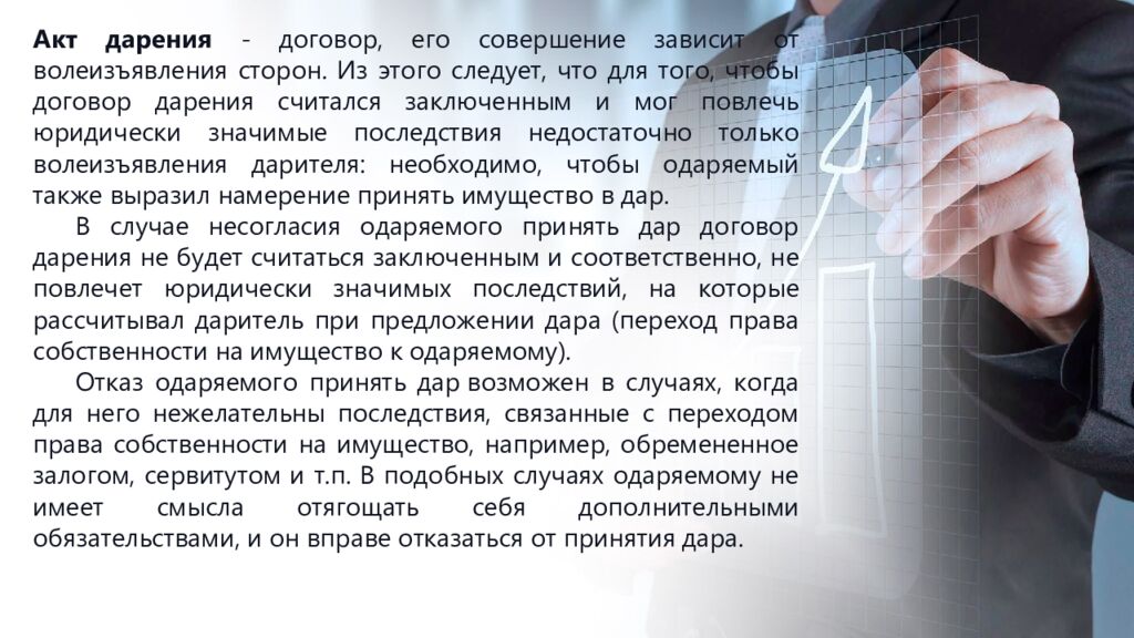 Акт дарения - договор, его совершение зависит от волеизъявления сторон. Из этого следует, что для того, чтобы договор дарения считался заключенным и мог повлечь юридически значимые последствия недостаточно только волеизъявления дарителя: необходимо, чтобы одаряемый также выразил намерение принять имущество в дар. В случае несогласия одаряемого принять дар договор дарения не будет считаться заключенным и соответственно, не повлечет юридически значимых последствий, на которые рассчитывал даритель при предложении дара (переход права собственности на имущество к одаряемому). Отказ одаряемого принять дар возможен в случаях, когда для него нежелательны последствия, связанные с переходом права собственности на имущество, например, обремененное залогом, сервитутом и т.п. В подобных случаях одаряемому не имеет смысла отягощать себя дополнительными обязательствами, и он вправе отказаться от принятия дара.