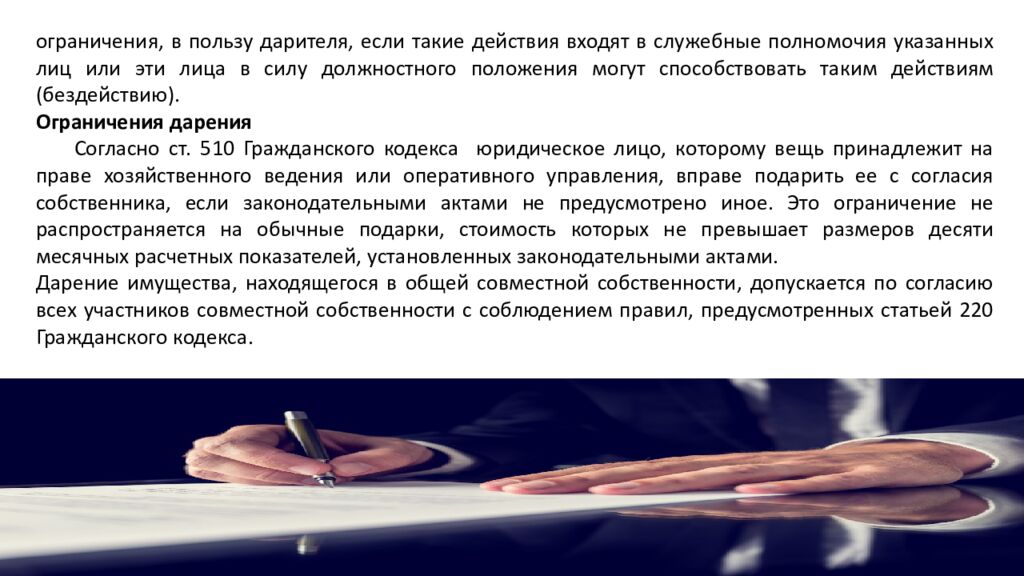 ограничения, в пользу дарителя, если такие действия входят в служебные полномочия указанных лиц или эти лица в силу должностного положения могут способствовать таким действиям (бездействию). Ограничения дарения Согласно ст. 510 Гражданского кодекса юридическое лицо, которому вещь принадлежит на праве хозяйственного ведения или оперативного управления, вправе подарить ее с согласия собственника, если законодательными актами не предусмотрено иное. Это ограничение не распространяется на обычные подарки, стоимость которых не превышает размеров десяти месячных расчетных показателей, установленных законодательными актами. Дарение имущества, находящегося в общей совместной собственности, допускается по согласию всех участников совместной собственности с соблюдением правил, предусмотренных статьей 220 Гражданского кодекса.