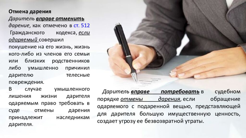 Отмена дарения Даритель вправе отменить дарение, как отмечено в ст. 512 Гражданского кодекса, если одаряемый совершил покушение на его жизнь, жизнь кого-либо из членов его семьи или близких родственников либо умышленно причинил дарителю телесные повреждения. В случае умышленного лишения жизни дарителя одаряемым право требовать в суде отмены дарения принадлежит наследникам дарителя. Даритель вправе потребовать в судебном порядке отмены дарения, если обращение одаряемого с подаренной вещью, представляющей для дарителя большую имущественную ценность, создает угрозу ее безвозвратной утраты.