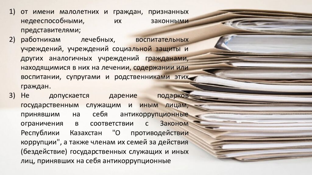 от имени малолетних и граждан, признанных недееспособными, их законными представителями; работникам лечебных, воспитательных учреждений, учреждений социальной защиты и других аналогичных учреждений гражданами, находящимися в них на лечении, содержании или воспитании, супругами и родственниками этих граждан. Не допускается дарение подарков государственным служащим и иным лицам, принявшим на себя антикоррупционные ограничения в соответствии с Законом Республики Казахстан "О противодействии коррупции", а также членам их семей за действия (бездействие) государственных служащих и иных лиц, принявших на себя антикоррупционные