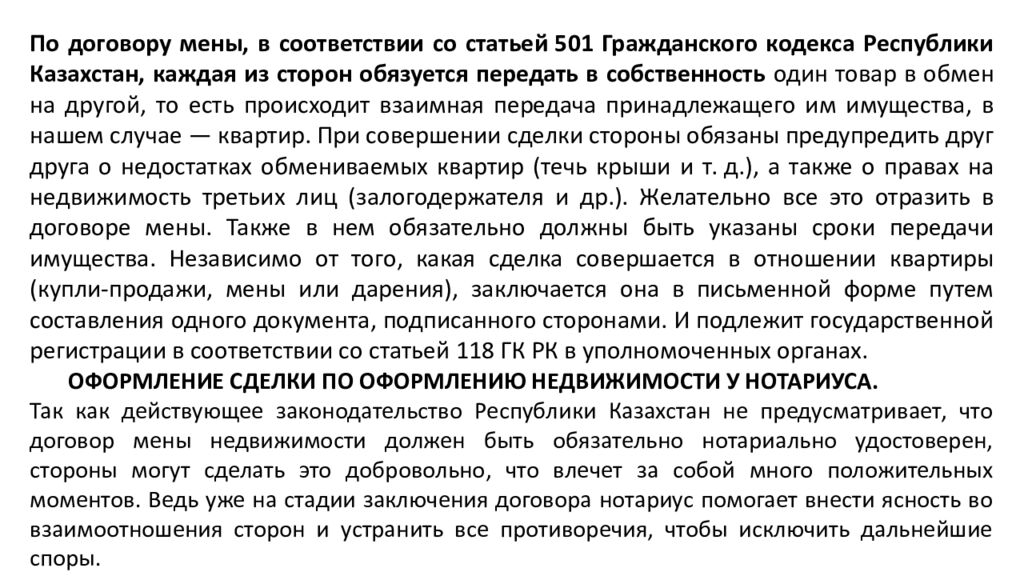 По договору мены, в соответствии со статьей 501 Гражданского кодекса Республики Казахстан, каждая из сторон обязуется передать в собственность один товар в обмен на другой, то есть происходит взаимная передача принадлежащего им имущества, в нашем случае — квартир. При совершении сделки стороны обязаны предупредить друг друга о недостатках обмениваемых квартир (течь крыши и т. д.), а также о правах на недвижимость третьих лиц (залогодержателя и др.). Желательно все это отразить в договоре мены. Также в нем обязательно должны быть указаны сроки передачи имущества. Независимо от того, какая сделка совершается в отношении квартиры (купли-продажи, мены или дарения), заключается она в письменной форме путем составления одного документа, подписанного сторонами. И подлежит государственной регистрации в соответствии со статьей 118 ГК РК в уполномоченных органах. ОФОРМЛЕНИЕ СДЕЛКИ ПО ОФОРМЛЕНИЮ НЕДВИЖИМОСТИ У НОТАРИУСА. Так как действующее законодательство Республики Казахстан не предусматривает, что договор мены недвижимости должен быть обязательно нотариально удостоверен, стороны могут сделать это добровольно, что влечет за собой много положительных моментов. Ведь уже на стадии заключения договора нотариус помогает внести ясность во взаимоотношения сторон и устранить все противоречия, чтобы исключить дальнейшие споры.