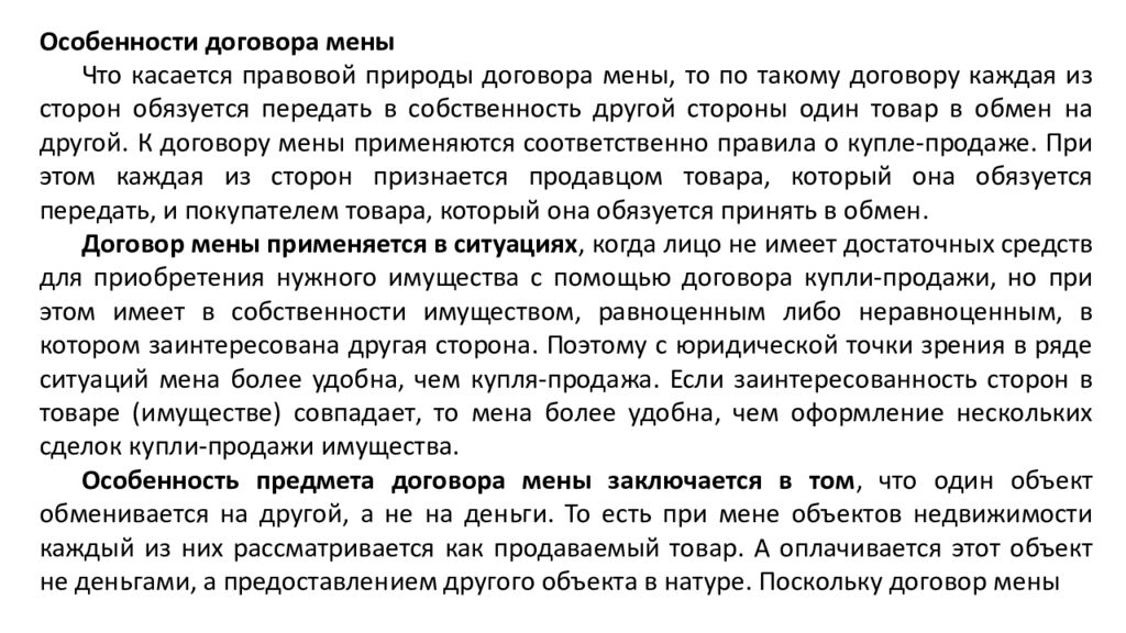 Особенности договора мены Что касается правовой природы договора мены, то по такому договору каждая из сторон обязуется передать в собственность другой стороны один товар в обмен на другой. К договору мены применяются соответственно правила о купле-продаже. При этом каждая из сторон признается продавцом товара, который она обязуется передать, и покупателем товара, который она обязуется принять в обмен. Договор мены применяется в ситуациях, когда лицо не имеет достаточных средств для приобретения нужного имущества с помощью договора купли-продажи, но при этом имеет в собственности имуществом, равноценным либо неравноценным, в котором заинтересована другая сторона. Поэтому с юридической точки зрения в ряде ситуаций мена более удобна, чем купля-продажа. Если заинтересованность сторон в товаре (имуществе) совпадает, то мена более удобна, чем оформление нескольких сделок купли-продажи имущества. Особенность предмета договора мены заключается в том, что один объект обменивается на другой, а не на деньги. То есть при мене объектов недвижимости каждый из них рассматривается как продаваемый товар. А оплачивается этот объект не деньгами, а предоставлением другого объекта в натуре. Поскольку договор мены