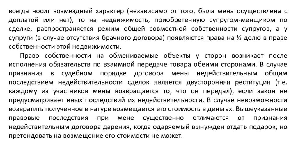 всегда носит возмездный характер (независимо от того, была мена осуществлена с доплатой или нет), то на недвижимость, приобретенную супругом- менщиком по сделке, распространяется режим общей совместной собственности супругов, а у супруги (в случае отсутствия брачного договора) появляются права на ½ долю в праве собственности этой недвижимости. Право собственности на обмениваемые объекты у сторон возникает после исполнения обязательств по взаимной передаче товара обеими сторонами. В случае признания в судебном порядке договора мены недействительным общим последствием недействительности сделок является двусторонняя реституция (т.е. каждому из участников мены возвращается то, что он передал), если закон не предусматривает иных последствий их недействительности. В случае невозможности возвратить полученное в натуре возмещается его стоимость в деньгах. Вышеуказанные правовые последствия при мене существенно отличаются от признания недействительным договора дарения, когда одаряемый вынужден отдать подарок, но претендовать на возмещение его стоимости не может.
