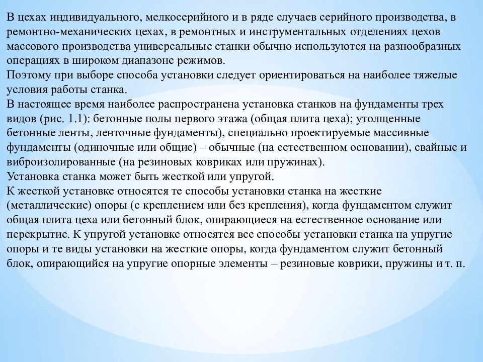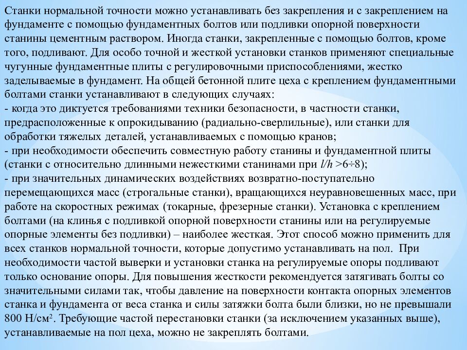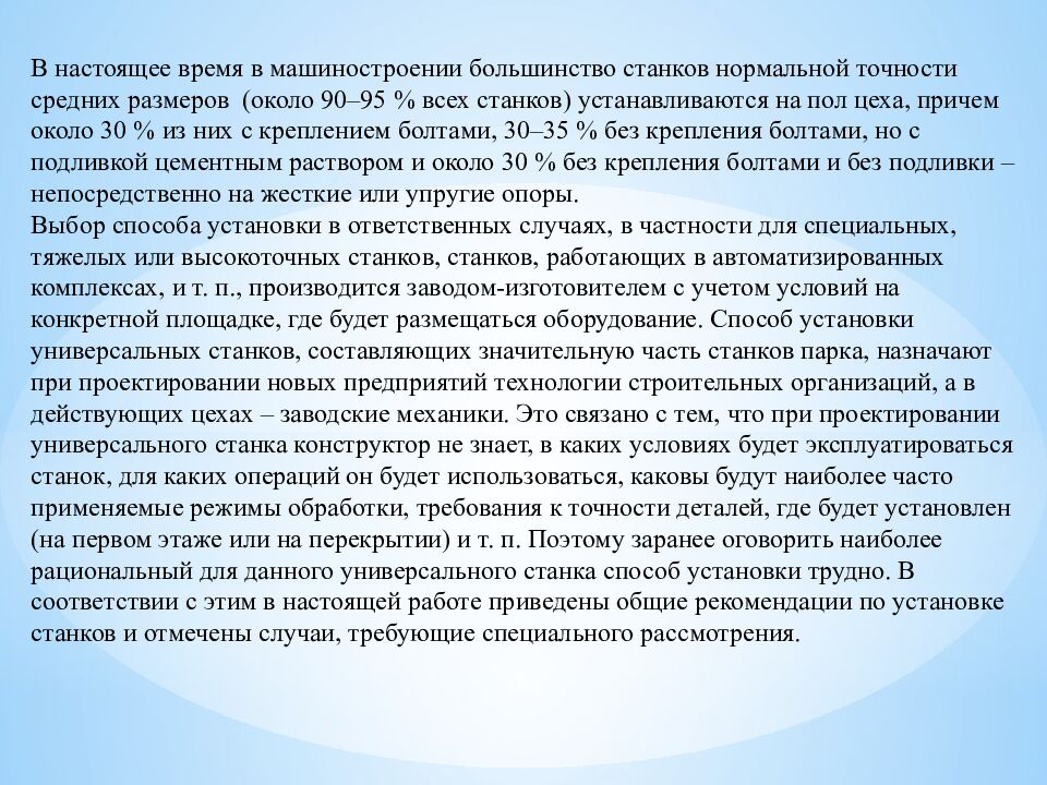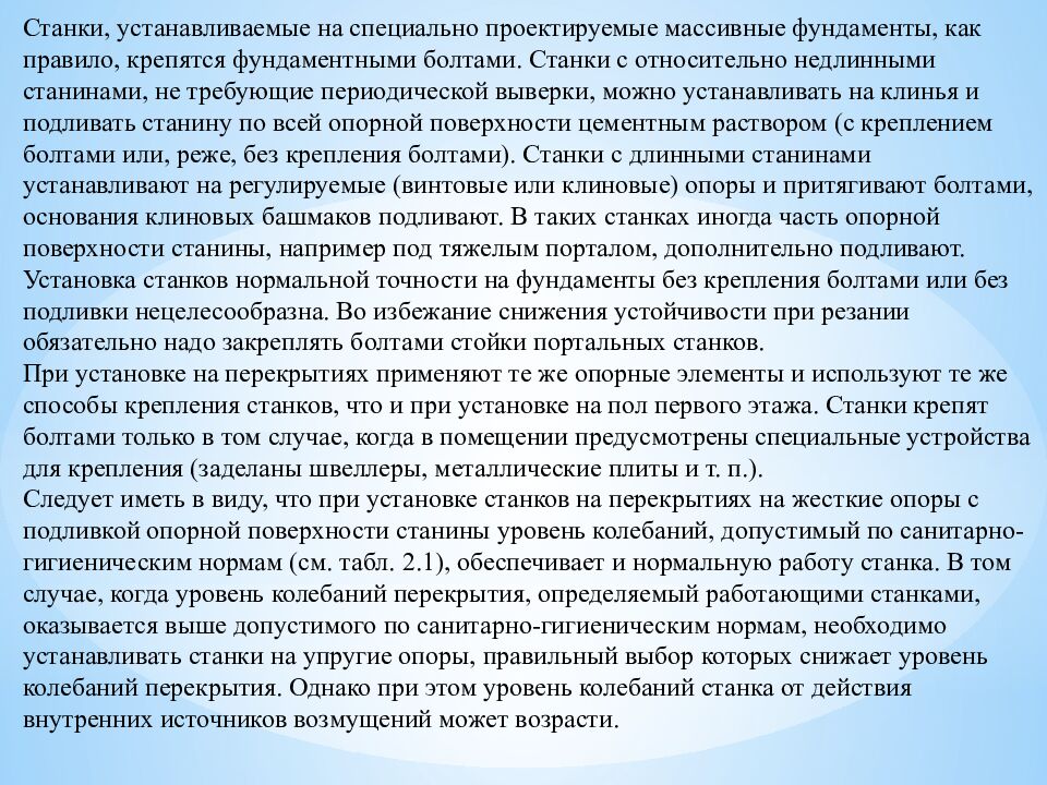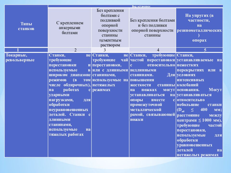 Типы станков Вид установки С креплением анкерными болтами Без крепления болтами с подливкой опорной поверхности станины цементным раствором Без крепления болтами и без подливки опорной поверхности станины На упругих (в частности, на резинометаллических) опорах 1 2 3 4 5 Токарные, револьверные Станки, не требующие перестановки и используемые в широком диапазоне режимов (в том числе обдирочных), на работах с ударными нагрузками, для обработки неуравновешенных деталей. Станки с длинными станинами, используемые на тяжелых работах Станки, не требующие чай перестановки, или с длинными станинами, используемые на нетяжелых режимах Станки, требующие частой перестановки с относительно недлинными станинами. Для повышения жесткости станины на ножках могут устанавливаться на опоры вместе с промежуточной металлической рамой, связывающей ножки Станки, устанавливаемые на нежестких перекрытиях или в условиях интенсивных колебаний основания. Могут устанавливаться относительно небольшие станки ( D нб ≤ 400 мм; расстояние между центрами ≤ 1000 мм), требующие частой перестановки, используемые для обработки уравновешенных деталей на нетяжелых режимах