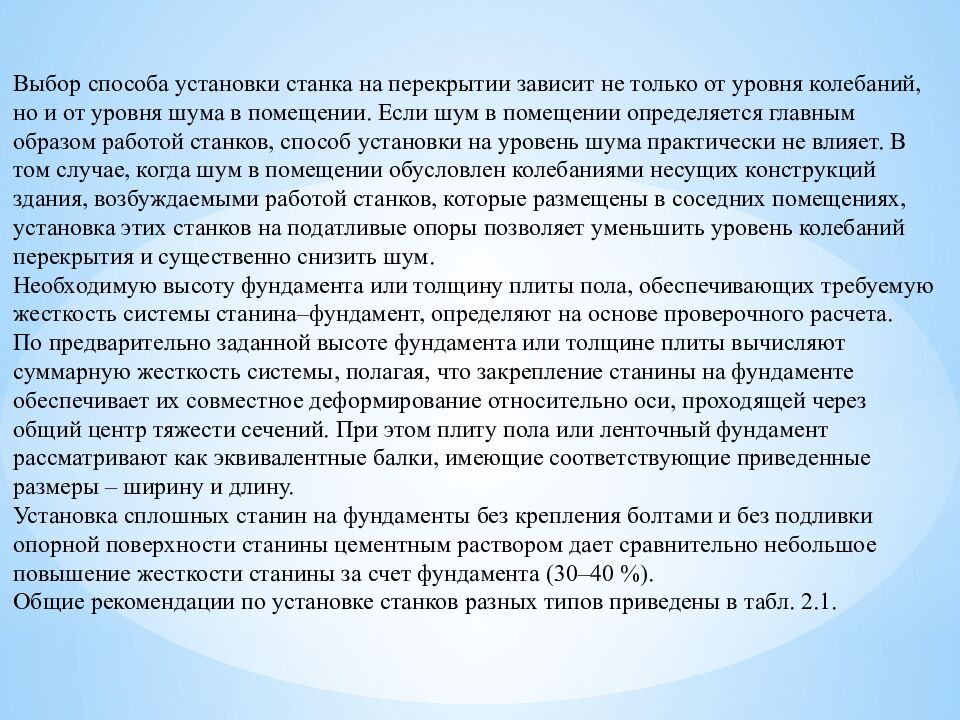Выбор способа установки станка на перекрытии зависит не только от уровня колебаний, но и от уровня шума в помещении. Если шум в помещении определяется главным образом работой станков, способ установки на уровень шума практически не влияет. В том случае, когда шум в помещении обусловлен колебаниями несущих конструкций здания, возбуждаемыми работой станков, которые размещены в соседних помещениях, установка этих станков на податливые опоры позволяет уменьшить уровень колебаний перекрытия и существенно снизить шум. Необходимую высоту фундамента или толщину плиты пола, обеспечивающих требуемую жесткость системы станина–фундамент, определяют на основе проверочного расчета. По предварительно заданной высоте фундамента или толщине плиты вычисляют суммарную жесткость системы, полагая, что закрепление станины на фундаменте обеспечивает их совместное деформирование относительно оси, проходящей через общий центр тяжести сечений. При этом плиту пола или ленточный фундамент рассматривают как эквивалентные балки, имеющие соответствующие приведенные размеры – ширину и длину. Установка сплошных станин на фундаменты без крепления болтами и без подливки опорной поверхности станины цементным раствором дает сравнительно небольшое повышение жесткости станины за счет фундамента (30–40 %). Общие рекомендации по установке станков разных типов приведены в табл. 2.1.
