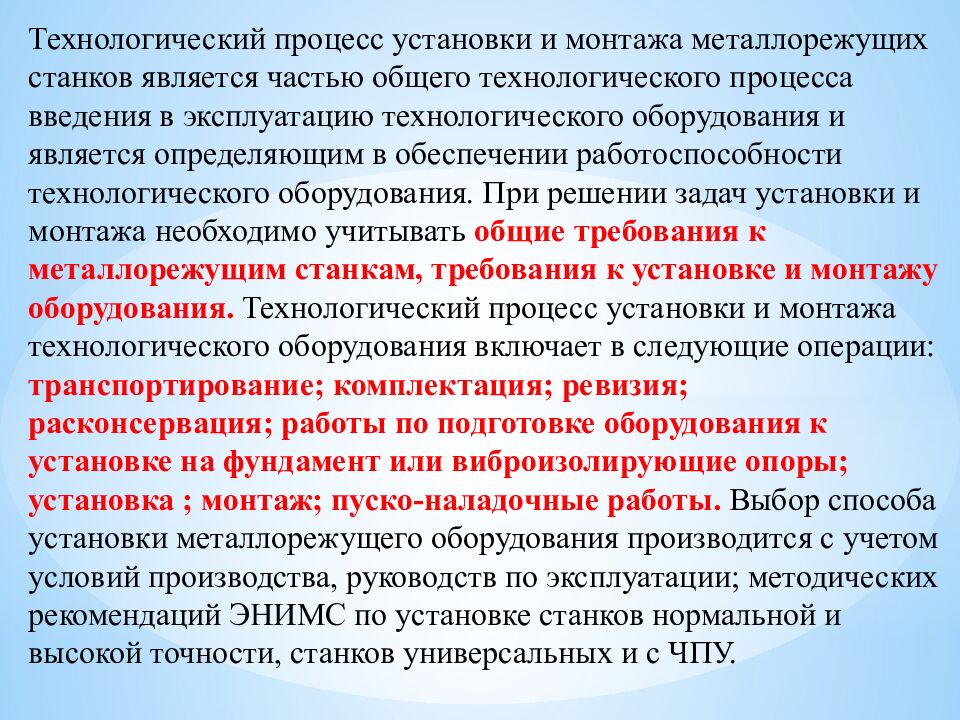 Технологический процесс установки и монтажа металлорежущих станков является частью общего технологического процесса введения в эксплуатацию технологического оборудования и является определяющим в обеспечении работоспособности технологического оборудования. При решении задач установки и монтажа необходимо учитывать общие требования к металлорежущим станкам, требования к установке и монтажу оборудования. Технологический процесс установки и монтажа технологического оборудования включает в следующие операции: транспортирование; комплектация; ревизия; расконсервация ; работы по подготовке оборудования к установке на фундамент или виброизолирующие опоры; установка ; монтаж; пуско-наладочные работы. Выбор способа установки металлорежущего оборудования производится с учетом условий производства, руководств по эксплуатации; методических рекомендаций ЭНИМС по установке станков нормальной и высокой точности, станков универсальных и с ЧПУ.