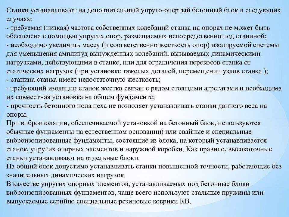 Станки устанавливают на дополнительный упруго-опертый бетонный блок в следующих случаях: - требуемая (низкая) частота собственных колебаний станка на опорах не может быть обеспечена с помощью упругих опор, размещаемых непосредственно под станиной; - необходимо увеличить массу (и соответственно жесткость опор) изолируемой системы для уменьшения амплитуд вынужденных колебаний, вызываемых динамическими нагрузками, действующими в станке, или для ограничения перекосов станка от статических нагрузок (при установке тяжелых деталей, перемещении узлов станка ); - станина станка имеет недостаточную жесткость; - требующий изоляции станок жестко связан с рядом стоящими агрегатами и необходима их совместная установка на общем фундаменте; - прочность бетонного пола цеха не позволяет устанавливать станки данного веса на опоры. При виброизоляции, обеспечиваемой установкой на бетонный блок, используются обычные фундаменты на естественном основании) или свайные и специальные виброизолированные фундаменты, состоящие из блока, на который устанавливается станок, упругих опорных элементов и наружной коробки. Как правило, высокоточные станки устанавливают на отдельные блоки. На общий блок допустимо устанавливать станки повышенной точности, работающие без значительных динамических нагрузок. В качестве упругих опорных элементов, устанавливаемых под бетонные блоки виброизолированных фундаментов, чаще всего используют стальные пружины или выпускаемые серийно специальные резиновые коврики КВ.