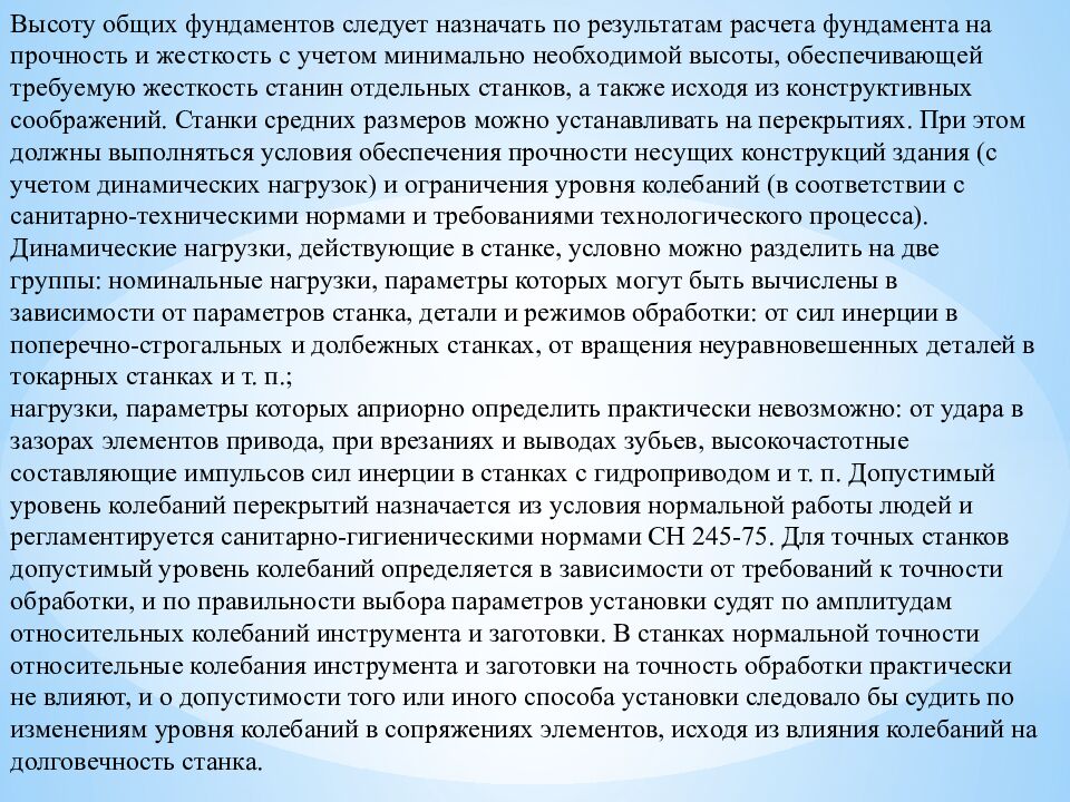 Высоту общих фундаментов следует назначать по результатам расчета фундамента на прочность и жесткость с учетом минимально необходимой высоты, обеспечивающей требуемую жесткость станин отдельных станков, а также исходя из конструктивных соображений. Станки средних размеров можно устанавливать на перекрытиях. При этом должны выполняться условия обеспечения прочности несущих конструкций здания (с учетом динамических нагрузок) и ограничения уровня колебаний (в соответствии с санитарно-техническими нормами и требованиями технологического процесса ). Динамические нагрузки, действующие в станке, условно можно разделить на две группы: номинальные нагрузки, параметры которых могут быть вычислены в зависимости от параметров станка, детали и режимов обработки: от сил инерции в поперечно-строгальных и долбежных станках, от вращения неуравновешенных деталей в токарных станках и т. п.; нагрузки, параметры которых априорно определить практически невозможно: от удара в зазорах элементов привода, при врезаниях и выводах зубьев, высокочастотные составляющие импульсов сил инерции в станках с гидроприводом и т. п. Допустимый уровень колебаний перекрытий назначается из условия нормальной работы людей и регламентируется санитарно-гигиеническими нормами СН 245-75. Для точных станков допустимый уровень колебаний определяется в зависимости от требований к точности обработки, и по правильности выбора параметров установки судят по амплитудам относительных колебаний инструмента и заготовки. В станках нормальной точности относительные колебания инструмента и заготовки на точность обработки практически не влияют, и о допустимости того или иного способа установки следовало бы судить по изменениям уровня колебаний в сопряжениях элементов, исходя из влияния колебаний на долговечность станка.