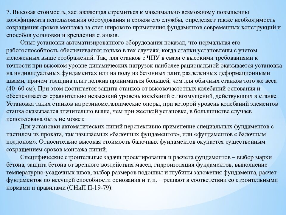 7. Высокая стоимость, заставляющая стремиться к максимально возможному повышению коэффициента использования оборудования и сроков его службы, определяет также необходимость сокращения сроков монтажа за счет широкого применения фундаментов современных конструкций и способов установки и крепления станков. Опыт установки автоматизированного оборудования показал, что нормальная его работоспособность обеспечивается только в тех случаях, когда станки установлены с учетом изложенных выше соображений. Так, для станков с ЧПУ в связи с высокими требованиями к точности при высоком уровне динамических нагрузок наиболее рациональной оказывается установка на индивидуальных фундаментах или на полу из бетонных плит, разделенных деформационными швами, причем толщина плит должна приниматься большей, чем для обычных станков того же веса (40–60 см). При этом достигается защита станков от высокочастотных колебаний основания и обеспечивается сравнительно невысокий уровень колебаний от возмущений, действующих в станке. Установка таких станков на резинометаллические опоры, при которой уровень колебаний элементов станка оказывается значительно выше, чем при жесткой установке, в большинстве случаев использована быть не может. Для установки автоматических линий перспективно применение специальных фундаментов с настилом из проката, так называемых «балочных фундаментов», или «фундаментов с балочным поддоном». Относительно высокая стоимость балочных фундаментов окупается существенным сокращением сроков монтажа линий. Специфические строительные задачи проектирования и расчета фундаментов – выбор марки бетона, защита бетона от вредного воздействия масел, гидроизоляция фундаментов, выполнение температурно-усадочных швов, выбор размеров подошвы и глубины заложения фундамента, расчет фундаментов по несущей способности основания и т. п. – решают в соответствии со строительными нормами и правилами (СНиП П-19-79).
