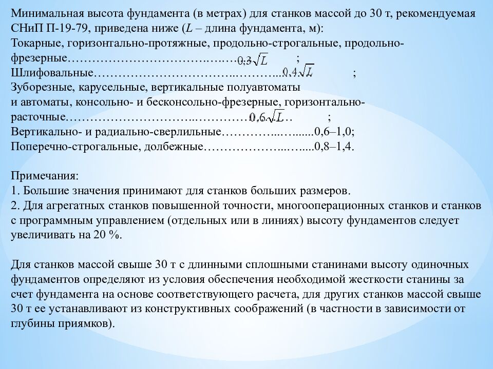 Минимальная высота фундамента (в метрах) для станков массой до 30 т, рекомендуемая СНиП П-19-79, приведена ниже ( L – длина фундамента, м ): Токарные, горизонтально-протяжные, продольно-строгальные, продольно-фрезерные…………………………….….…...... ; Шлифовальные……………………………..………....……. ; Зуборезные, карусельные, вертикальные полуавтоматы и автоматы, консольно- и бесконсольно -фрезерные, горизонтально-расточные…………………………..…………………… ; Вертикально- и радиально-сверлильные…………...….......0,6–1,0; Поперечно-строгальные, долбежные………………...….....0,8–1,4. Примечания: 1. Большие значения принимают для станков больших размеров. 2. Для агрегатных станков повышенной точности, многооперационных станков и станков с программным управлением (отдельных или в линиях) высоту фундаментов следует увеличивать на 20 %. Для станков массой свыше 30 т с длинными сплошными станинами высоту одиночных фундаментов определяют из условия обеспечения необходимой жесткости станины за счет фундамента на основе соответствующего расчета, для других станков массой свыше 30 т ее устанавливают из конструктивных соображений (в частности в зависимости от глубины приямков).