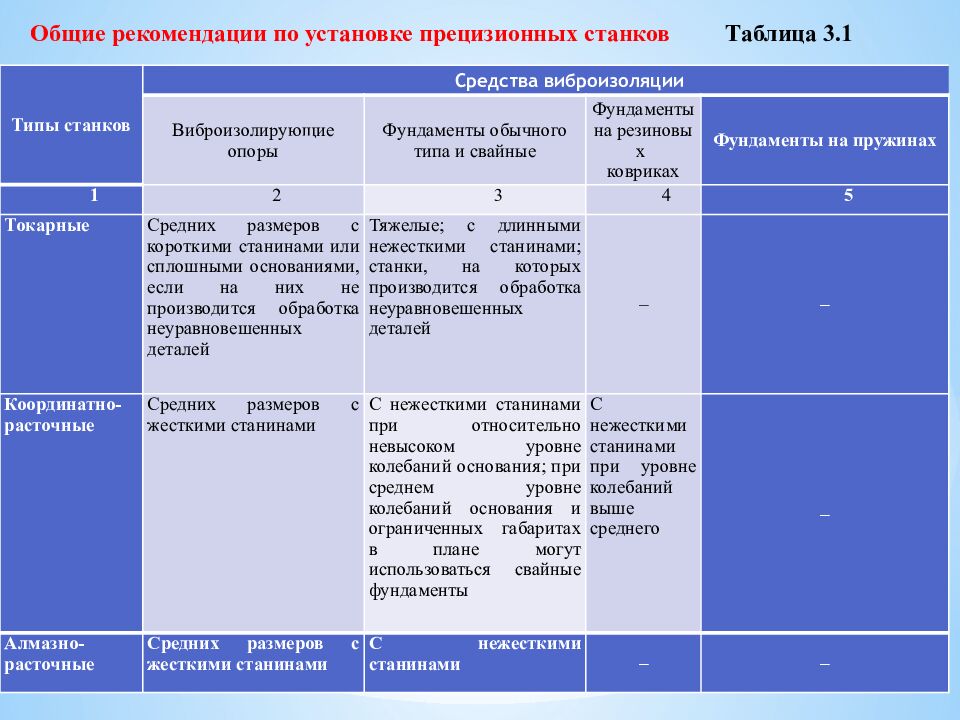 Типы станков Средства виброизоляции Виброизолирующие опоры Фундаменты обычного типа и свайные Фундаменты на резиновых ковриках Фундаменты на пружинах 1 2 3 4 5 Токарные Средних размеров с короткими станинами или сплошными основаниями, если на них не производится обработка неуравновешенных деталей Тяжелые; с длинными нежесткими станинами; станки, на которых производится обработка неуравновешенных деталей – – Координатно-расточные Средних размеров с жесткими станинами С нежесткими станинами при относительно невысоком уровне колебаний основания; при среднем уровне колебаний основания и ограниченных габаритах в плане могут использоваться свайные фундаменты С нежесткими станинами при уровне колебаний выше среднего – Алмазно-расточные Средних размеров с жесткими станинами С нежесткими станинами – – 4 3 Общие рекомендации по установке прецизионных станков Таблица 3.1