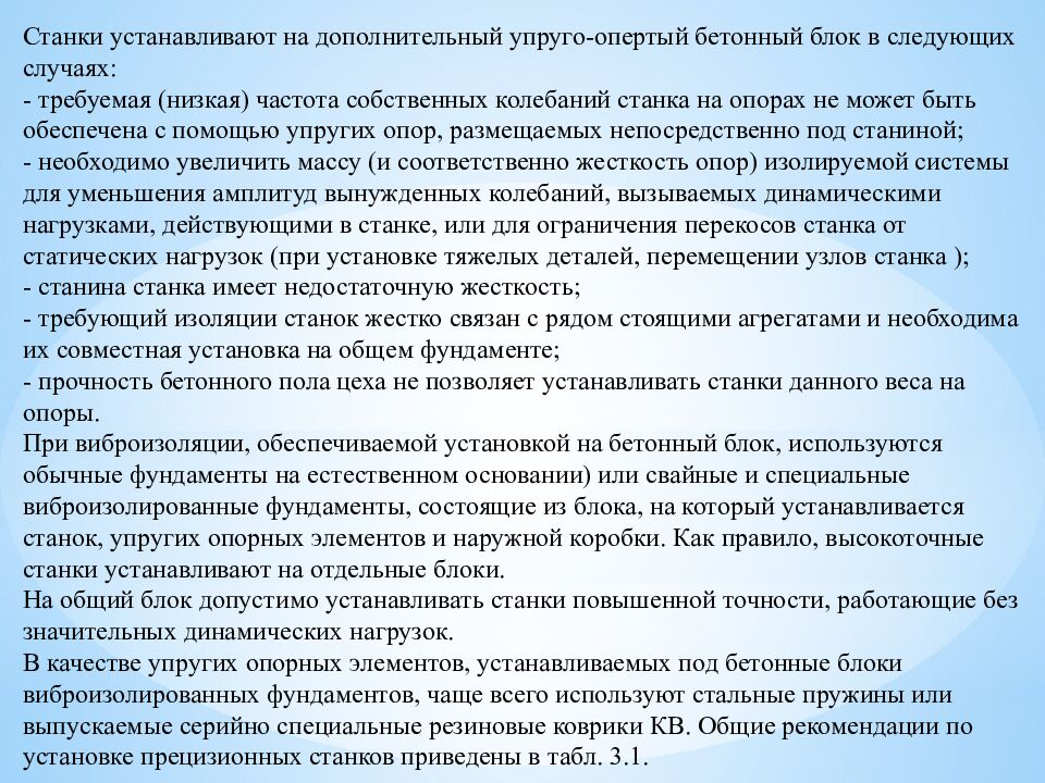 Станки устанавливают на дополнительный упруго-опертый бетонный блок в следующих случаях: - требуемая (низкая) частота собственных колебаний станка на опорах не может быть обеспечена с помощью упругих опор, размещаемых непосредственно под станиной; - необходимо увеличить массу (и соответственно жесткость опор) изолируемой системы для уменьшения амплитуд вынужденных колебаний, вызываемых динамическими нагрузками, действующими в станке, или для ограничения перекосов станка от статических нагрузок (при установке тяжелых деталей, перемещении узлов станка ); - станина станка имеет недостаточную жесткость; - требующий изоляции станок жестко связан с рядом стоящими агрегатами и необходима их совместная установка на общем фундаменте; - прочность бетонного пола цеха не позволяет устанавливать станки данного веса на опоры. При виброизоляции, обеспечиваемой установкой на бетонный блок, используются обычные фундаменты на естественном основании) или свайные и специальные виброизолированные фундаменты, состоящие из блока, на который устанавливается станок, упругих опорных элементов и наружной коробки. Как правило, высокоточные станки устанавливают на отдельные блоки. На общий блок допустимо устанавливать станки повышенной точности, работающие без значительных динамических нагрузок. В качестве упругих опорных элементов, устанавливаемых под бетонные блоки виброизолированных фундаментов, чаще всего используют стальные пружины или выпускаемые серийно специальные резиновые коврики КВ. Общие рекомендации по установке прецизионных станков приведены в табл. 3.1.