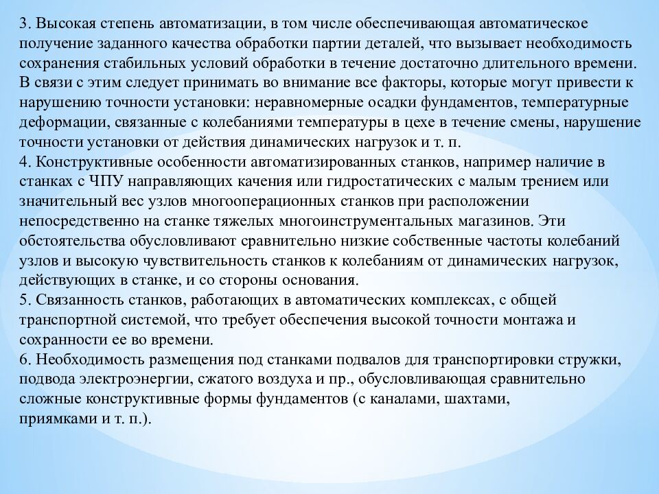 3. Высокая степень автоматизации, в том числе обеспечивающая автоматическое получение заданного качества обработки партии деталей, что вызывает необходимость сохранения стабильных условий обработки в течение достаточно длительного времени. В связи с этим следует принимать во внимание все факторы, которые могут привести к нарушению точности установки: неравномерные осадки фундаментов, температурные деформации, связанные с колебаниями температуры в цехе в течение смены, нарушение точности установки от действия динамических нагрузок и т. п. 4. Конструктивные особенности автоматизированных станков, например наличие в станках с ЧПУ направляющих качения или гидростатических с малым трением или значительный вес узлов многооперационных станков при расположении непосредственно на станке тяжелых многоинструментальных магазинов. Эти обстоятельства обусловливают сравнительно низкие собственные частоты колебаний узлов и высокую чувствительность станков к колебаниям от динамических нагрузок, действующих в станке, и со стороны основания. 5. Связанность станков, работающих в автоматических комплексах, с общей транспортной системой, что требует обеспечения высокой точности монтажа и сохранности ее во времени. 6. Необходимость размещения под станками подвалов для транспортировки стружки, подвода электроэнергии, сжатого воздуха и пр., обусловливающая сравнительно сложные конструктивные формы фундаментов (с каналами, шахтами, приямками и т. п.).