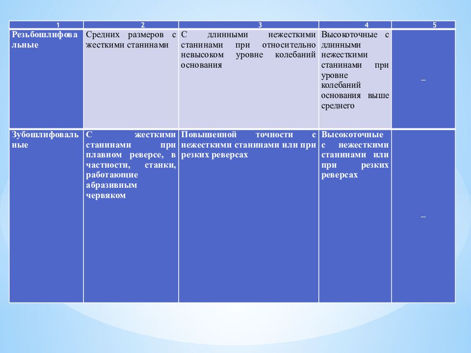 1 2 3 4 5 Резьбошлифовальные Средних размеров с жесткими станинами С длинными нежесткими станинами при относительно невысоком уровне колебаний основания Высокоточные с длинными нежесткими станинами при уровне колебаний основания выше среднего – Зубошлифовальные С жесткими станинами при плавном реверсе, в частности, станки, работающие абразивным червяком Повышенной точности с нежесткими станинами или при резких реверсах Высокоточные с нежесткими станинами или при резких реверсах –