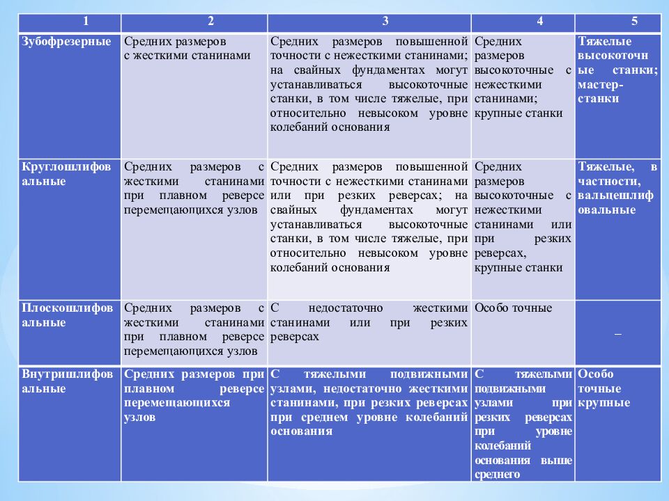 1 2 3 4 5 Зубофрезерные Средних размеров с жесткими станинами Средних размеров повышенной точности с нежесткими станинами; на свайных фундаментах могут устанавливаться высокоточные станки, в том числе тяжелые, при относительно невысоком уровне колебаний основания Средних размеров высокоточные с нежесткими станинами; крупные станки Тяжелые высокоточные станки; мастер-станки Круглошлифовальные Средних размеров с жесткими станинами при плавном реверсе перемещающихся узлов Средних размеров повышенной точности с нежесткими станинами или при резких реверсах; на свайных фундаментах могут устанавливаться высокоточные станки, в том числе тяжелые, при относительно невысоком уровне колебаний основания Средних размеров высокоточные с нежесткими станинами или при резких реверсах, крупные станки Тяжелые, в частности, вальцешлифовальные Плоскошлифовальные Средних размеров с жесткими станинами при плавном реверсе перемещающихся узлов С недостаточно жесткими станинами или при резких реверсах Особо точные – Внутришлифовальные Средних размеров при плавном реверсе перемещающихся узлов С тяжелыми подвижными узлами, недостаточно жесткими станинами, при резких реверсах при среднем уровне колебаний основания С тяжелыми подвижными узлами при резких реверсах при уровне колебаний основания выше среднего Особо точные крупные