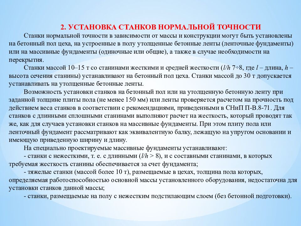 2. УСТАНОВКА СТАНКОВ НОРМАЛЬНОЙ ТОЧНОСТИ Станки нормальной точности в зависимости от массы и конструкции могут быть установлены на бетонный пол цеха, на устроенные в полу утолщенные бетонные ленты (ленточные фундаменты) или на массивные фундаменты (одиночные или общие), а также в случае необходимости на перекрытия. Станки массой 10–15 т со станинами жесткими и средней жесткости ( l / h 7÷8, где l – длина, h – высота сечения станины) устанавливают на бетонный пол цеха. Станки массой до 30 т допускается устанавливать на утолщенные бетонные ленты. Возможность установки станков на бетонный пол или на утолщенную бетонную ленту при заданной толщине плиты пола (не менее 150 мм) или ленты проверяется расчетом на прочность под действием веса станков в соответствии с рекомендациями, приведенными в СНиП П-В.8-71. Для станков с длинными сплошными станинами выполняют расчет на жесткость, который проводят так же, как для случаев установки станков на массивные фундаменты. При этом плиту пола или ленточный фундамент рассматривают как эквивалентную балку, лежащую на упругом основании и имеющую приведенную ширину и длину. На специально проектируемые массивные фундаменты устанавливают: - станки с нежесткими, т. е. с длинными ( l / h > 8), и с составными станинами, в которых требуемая жесткость станины обеспечивается за счет фундамента; - тяжелые станки (массой более 10 т), размещаемые в цехах, толщина пола которых, определяемая работоспособностью основной массы установленного оборудования, недостаточна для установки станков данной массы; - станки, размещаемые на полу с нежестким подстилающим слоем (без бетонной подготовки).