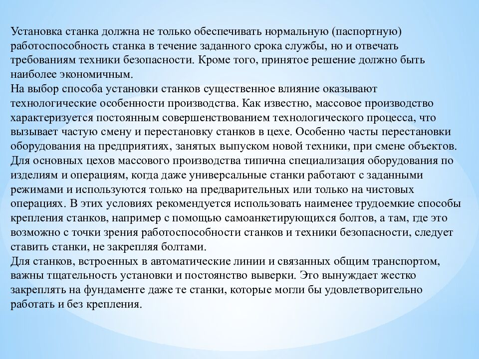 Установка станка должна не только обеспечивать нормальную (паспортную) работоспособность станка в течение заданного срока службы, но и отвечать требованиям техники безопасности. Кроме того, принятое решение должно быть наиболее экономичным. На выбор способа установки станков существенное влияние оказывают технологические особенности производства. Как известно, массовое производство характеризуется постоянным совершенствованием технологического процесса, что вызывает частую смену и перестановку станков в цехе. Особенно часты перестановки оборудования на предприятиях, занятых выпуском новой техники, при смене объектов. Для основных цехов массового производства типична специализация оборудования по изделиям и операциям, когда даже универсальные станки работают с заданными режимами и используются только на предварительных или только на чистовых операциях. В этих условиях рекомендуется использовать наименее трудоемкие способы крепления станков, например с помощью самоанкетирующихся болтов, а там, где это возможно с точки зрения работоспособности станков и техники безопасности, следует ставить станки, не закрепляя болтами. Для станков, встроенных в автоматические линии и связанных общим транспортом, важны тщательность установки и постоянство выверки. Это вынуждает жестко закреплять на фундаменте даже те станки, которые могли бы удовлетворительно работать и без крепления.