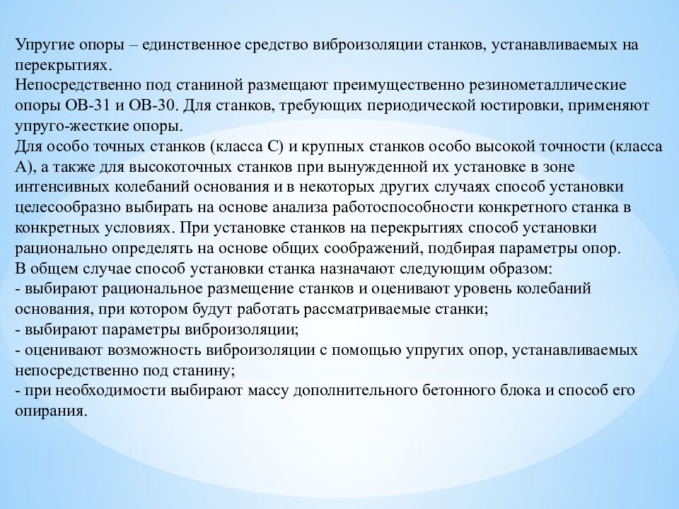 Упругие опоры – единственное средство виброизоляции станков, устанавливаемых на перекрытиях. Непосредственно под станиной размещают преимущественно резинометаллические опоры ОВ-31 и ОВ-30. Для станков, требующих периодической юстировки, применяют упруго-жесткие опоры. Для особо точных станков (класса С) и крупных станков особо высокой точности (класса А), а также для высокоточных станков при вынужденной их установке в зоне интенсивных колебаний основания и в некоторых других случаях способ установки целесообразно выбирать на основе анализа работоспособности конкретного станка в конкретных условиях. При установке станков на перекрытиях способ установки рационально определять на основе общих соображений, подбирая параметры опор. В общем случае способ установки станка назначают следующим образом: - выбирают рациональное размещение станков и оценивают уровень колебаний основания, при котором будут работать рассматриваемые станки; - выбирают параметры виброизоляции; - оценивают возможность виброизоляции с помощью упругих опор, устанавливаемых непосредственно под станину; - при необходимости выбирают массу дополнительного бетонного блока и способ его опирания.