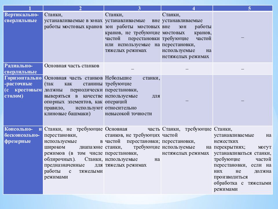 1 2 3 4 5 Вертикально-сверлильные Станки, устанавливаемые в зонах работы мостовых кранов Станки, устанавливаемые вне зон работы мостовых кранов, не требующие частой перестановки или используемые на тяжелых режимах Станки, устанавливаемые вне зон работы мостовых кранов, требующие частой перестановки, используемые на нетяжелых режимах – Радиально-сверлильные Основная часть станков – – – Горизонтально-расточные (с крестовым столом) Основная часть станков (так как станины должны периодически выверяться в качестве опорных элементов, как правило, используют клиновые башмаки) Небольшие станки, требующие перестановки, используемые для операций относительно невысокой точности – – Консольно- и бесконсольно-фрезерные Станки, не требующие перестановки, используемые в широком диапазоне режимов (в том числе обдирочных). Станки, предназначенные для работы с тяжелыми режимами Основная часть станков, не требующих частой перестановки; станки, требующие перестановки, используемые на тяжелых режимах Станки, требующие частой перестановки, используемые на нетяжелых режимах Станки, устанавливаемые на нежестких перекрытиях; могут устанавливаться станки, требующие частой перестановки, если на них не должна производиться обработка с тяжелыми режимами