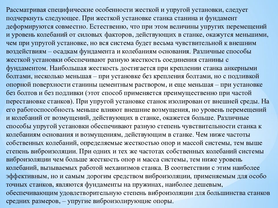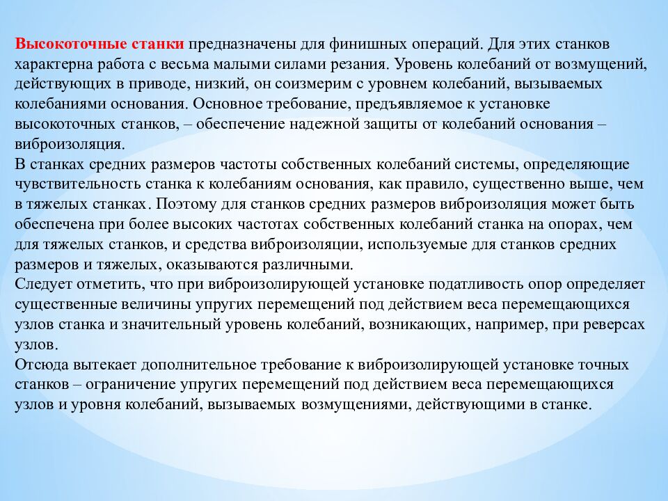 Высокоточные станки предназначены для финишных операций. Для этих станков характерна работа с весьма малыми силами резания. Уровень колебаний от возмущений, действующих в приводе, низкий, он соизмерим с уровнем колебаний, вызываемых колебаниями основания. Основное требование, предъявляемое к установке высокоточных станков, – обеспечение надежной защиты от колебаний основания – виброизоляция. В станках средних размеров частоты собственных колебаний системы, определяющие чувствительность станка к колебаниям основания, как правило, существенно выше, чем в тяжелых станках. Поэтому для станков средних размеров виброизоляция может быть обеспечена при более высоких частотах собственных колебаний станка на опорах, чем для тяжелых станков, и средства виброизоляции, используемые для станков средних размеров и тяжелых, оказываются различными. Следует отметить, что при виброизолирующей установке податливость опор определяет существенные величины упругих перемещений под действием веса перемещающихся узлов станка и значительный уровень колебаний, возникающих, например, при реверсах узлов. Отсюда вытекает дополнительное требование к виброизолирующей установке точных станков – ограничение упругих перемещений под действием веса перемещающихся узлов и уровня колебаний, вызываемых возмущениями, действующими в станке.