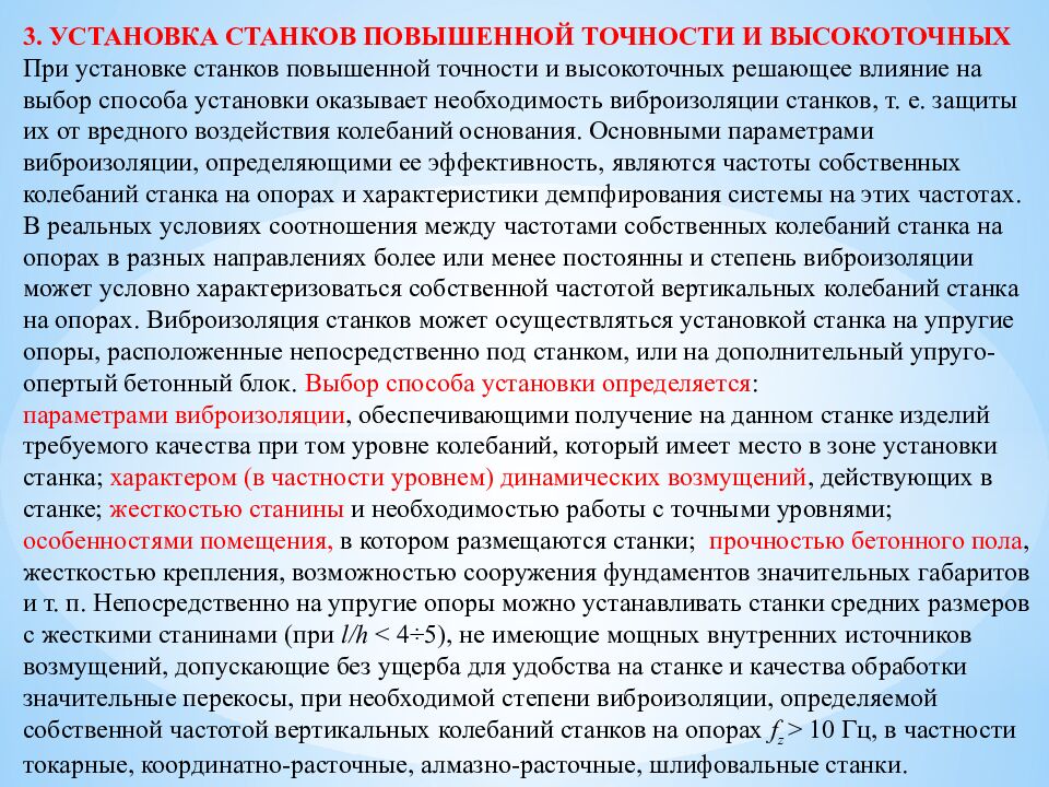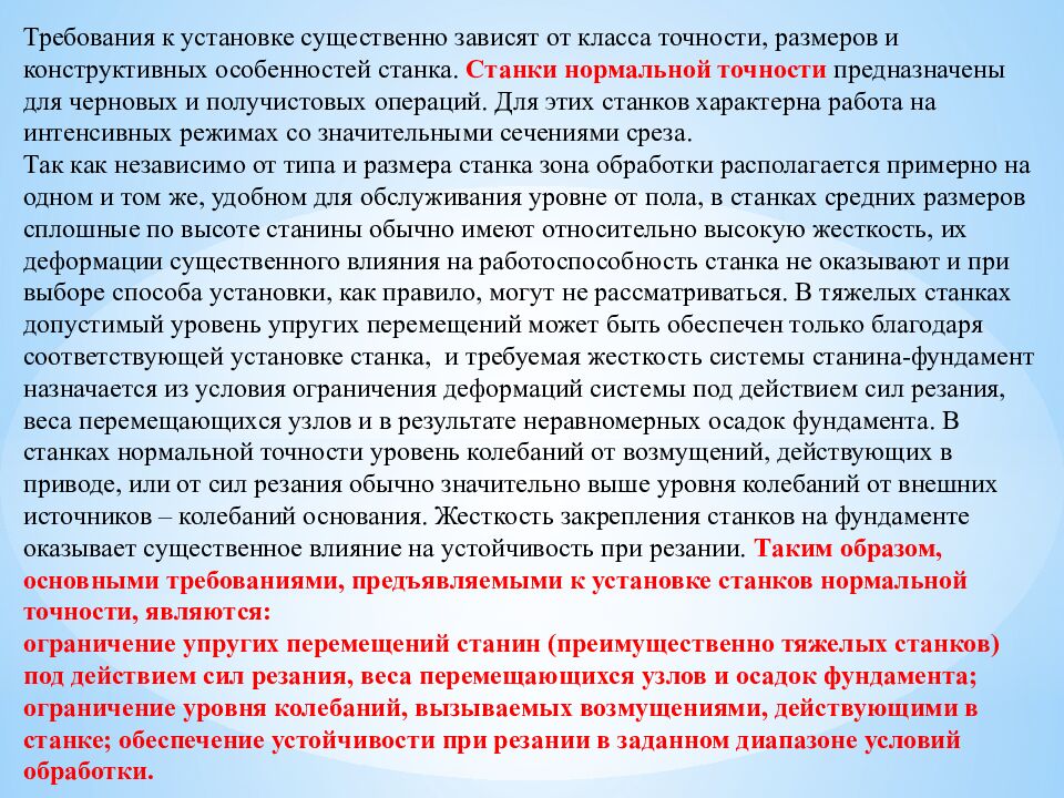 Требования к установке существенно зависят от класса точности, размеров и конструктивных особенностей станка. Станки нормальной точности предназначены для черновых и получистовых операций. Для этих станков характерна работа на интенсивных режимах со значительными сечениями среза. Так как независимо от типа и размера станка зона обработки располагается примерно на одном и том же, удобном для обслуживания уровне от пола, в станках средних размеров сплошные по высоте станины обычно имеют относительно высокую жесткость, их деформации существенного влияния на работоспособность станка не оказывают и при выборе способа установки, как правило, могут не рассматриваться. В тяжелых станках допустимый уровень упругих перемещений может быть обеспечен только благодаря соответствующей установке станка, и требуемая жесткость системы станина-фундамент назначается из условия ограничения деформаций системы под действием сил резания, веса перемещающихся узлов и в результате неравномерных осадок фундамента. В станках нормальной точности уровень колебаний от возмущений, действующих в приводе, или от сил резания обычно значительно выше уровня колебаний от внешних источников – колебаний основания. Жесткость закрепления станков на фундаменте оказывает существенное влияние на устойчивость при резании. Таким образом, основными требованиями, предъявляемыми к установке станков нормальной точности, являются: ограничение упругих перемещений станин (преимущественно тяжелых станков) под действием сил резания, веса перемещающихся узлов и осадок фундамента ; ограничение уровня колебаний, вызываемых возмущениями, действующими в станке; обеспечение устойчивости при резании в заданном диапазоне условий обработки.