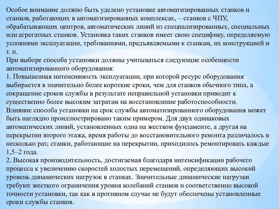 Особое внимание должно быть уделено установке автоматизированных станков и станков, работающих в автоматизированных комплексах, – станков с ЧПУ, обрабатывающих центров, автоматических линий из специализированных, специальных или агрегатных станков. Установка таких станков имеет свою специфику, определяемую условиями эксплуатации, требованиями, предъявляемыми к станкам, их конструкцией и т. п. При выборе способа установки должны учитываться следующие особенности автоматизированного оборудования: 1. Повышенная интенсивность эксплуатации, при которой ресурс оборудования выбирается в значительно более короткие сроки, чем для станков обычного типа, а сокращение сроков службы в результате неправильной установки приводит к существенно более высоким затратам на восстановление работоспособности. Влияние способа установки на срок службы автоматизированного оборудования может быть наглядно проиллюстрировано таким примером. Для двух одинаковых автоматических линий, установленных одна на жестком фундаменте, а другая на перекрытии второго этажа, время работы до восстановительного ремонта различалось в несколько раз; станки, работающие на перекрытии, приходилось ремонтировать каждые 1,5–2 года. 2. Высокая производительность, достигаемая благодаря интенсификации рабочего процесса к увеличению скоростей холостых перемещений, определяющих высокий уровень динамических нагрузок в станках. Значительные динамические нагрузки требуют жесткого ограничения уровня колебаний станков и соответственно высокой точности установки, так как в противном случае не будут обеспечены установленные сроки службы станков.