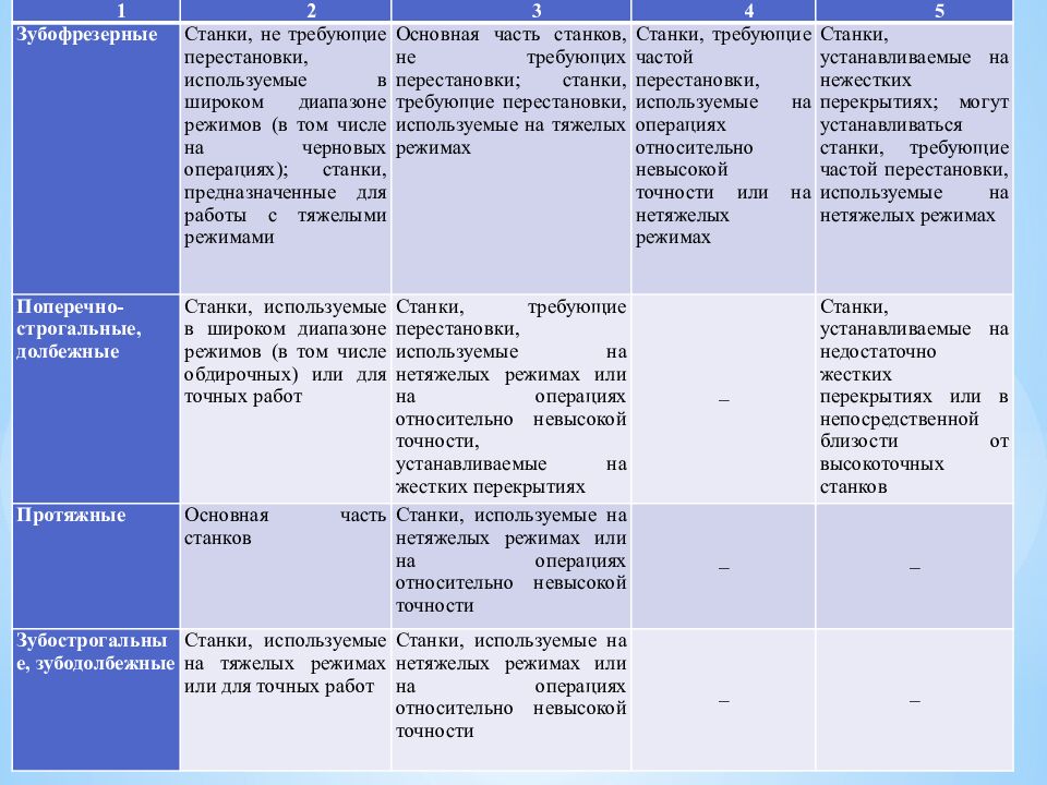 1 2 3 4 5 Зубофрезерные Станки, не требующие перестановки, используемые в широком диапазоне режимов (в том числе на черновых операциях); станки, предназначенные для работы с тяжелыми режимами Основная часть станков, не требующих перестановки; станки, требующие перестановки, используемые на тяжелых режимах Станки, требующие частой перестановки, используемые на операциях относительно невысокой точности или на нетяжелых режимах Станки, устанавливаемые на нежестких перекрытиях; могут устанавливаться станки, требующие частой перестановки, используемые на нетяжелых режимах Поперечно-строгальные, долбежные Станки, используемые в широком диапазоне режимов (в том числе обдирочных) или для точных работ Станки, требующие перестановки, используемые на нетяжелых режимах или на операциях относительно невысокой точности, устанавливаемые на жестких перекрытиях – Станки, устанавливаемые на недостаточно жестких перекрытиях или в непосредственной близости от высокоточных станков Протяжные Основная часть станков Станки, используемые на нетяжелых режимах или на операциях относительно невысокой точности – – Зубострогальные, зубодолбежные Станки, используемые на тяжелых режимах или для точных работ Станки, используемые на нетяжелых режимах или на операциях относительно невысокой точности – –
