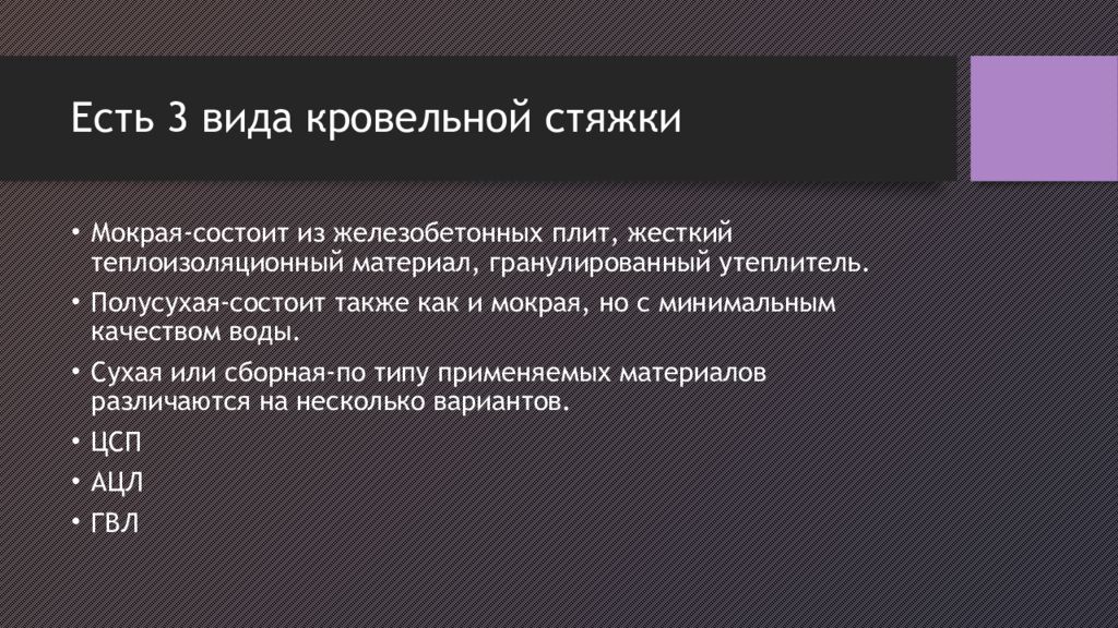 Мокрая-состоит из железобетонных плит, жесткий теплоизоляционный материал, гранулированный утеплитель. Полусухая-состоит также как и мокрая, но с минимальным качеством воды. Сухая или сборная - по типу применяемых материалов различаются на несколько вариантов. ЦСП АЦЛ ГВЛ