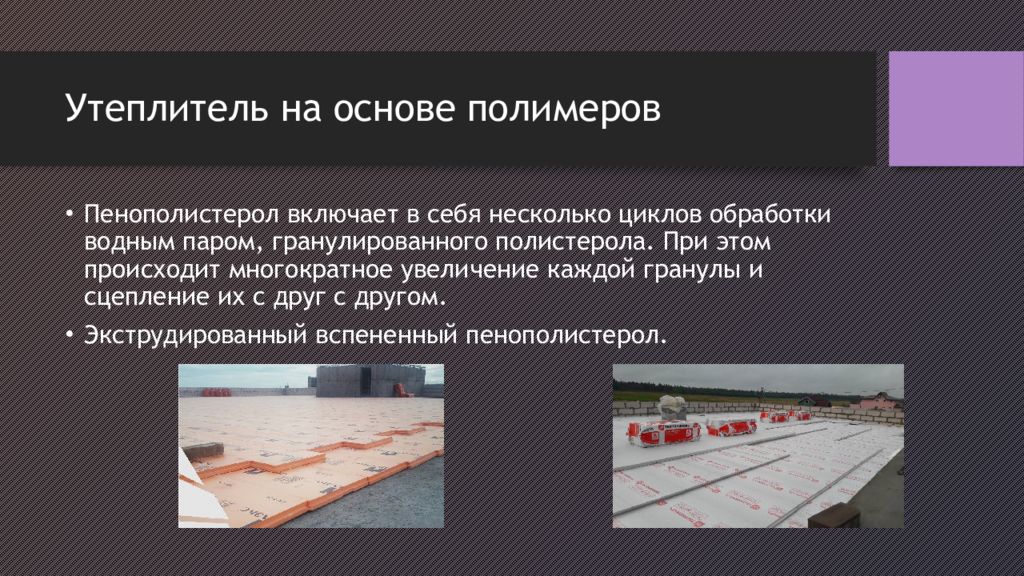 Пенополистерол включает в себя несколько циклов обработки водным паром, гранулированного полистерола. При этом происходит многократное увеличение каждой гранулы и сцепление их с друг с другом. Экструдированный вспененный пенополистерол.