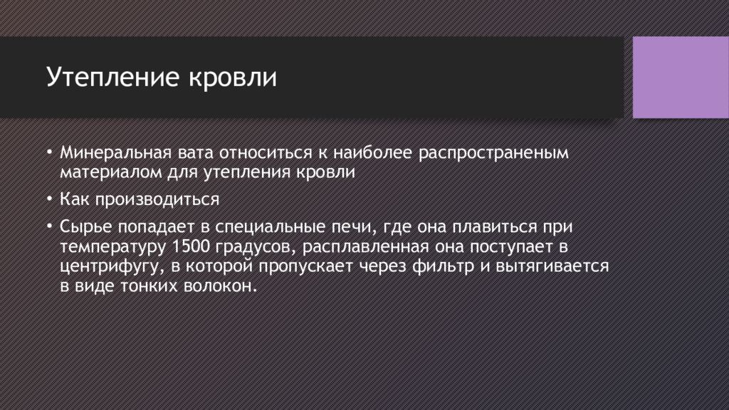 Минеральная вата относиться к наиболее распространеным материалом для утепления кровли Как производиться Сырье попадает в специальные печи, где она плавиться при температуру 1500 градусов, расплавленная она поступает в центрифугу, в которой пропускает через фильтр и вытягивается в виде тонких волокон.