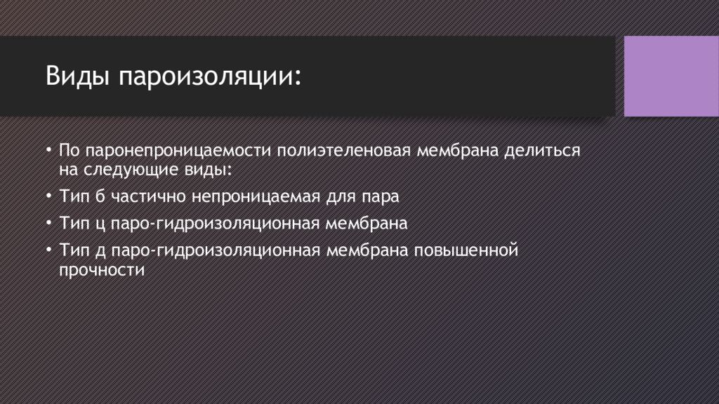 По паронепроницаемости полиэтеленовая мембрана делиться на следующие виды: Тип б частично непроницаемая для пара Тип ц паро-гидроизоляционная мембрана Тип д паро-гидроизоляционная мембрана повышенной прочности