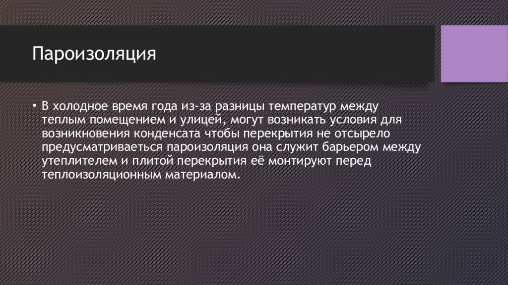 В холодное время года из-за разницы температур между теплым помещением и улицей, могут возникать условия для возникновения конденсата чтобы перекрытия не отсырело предусматриваеться пароизоляция она служит барьером между утеплителем и плитой перекрытия её монтируют перед теплоизоляционным материалом.